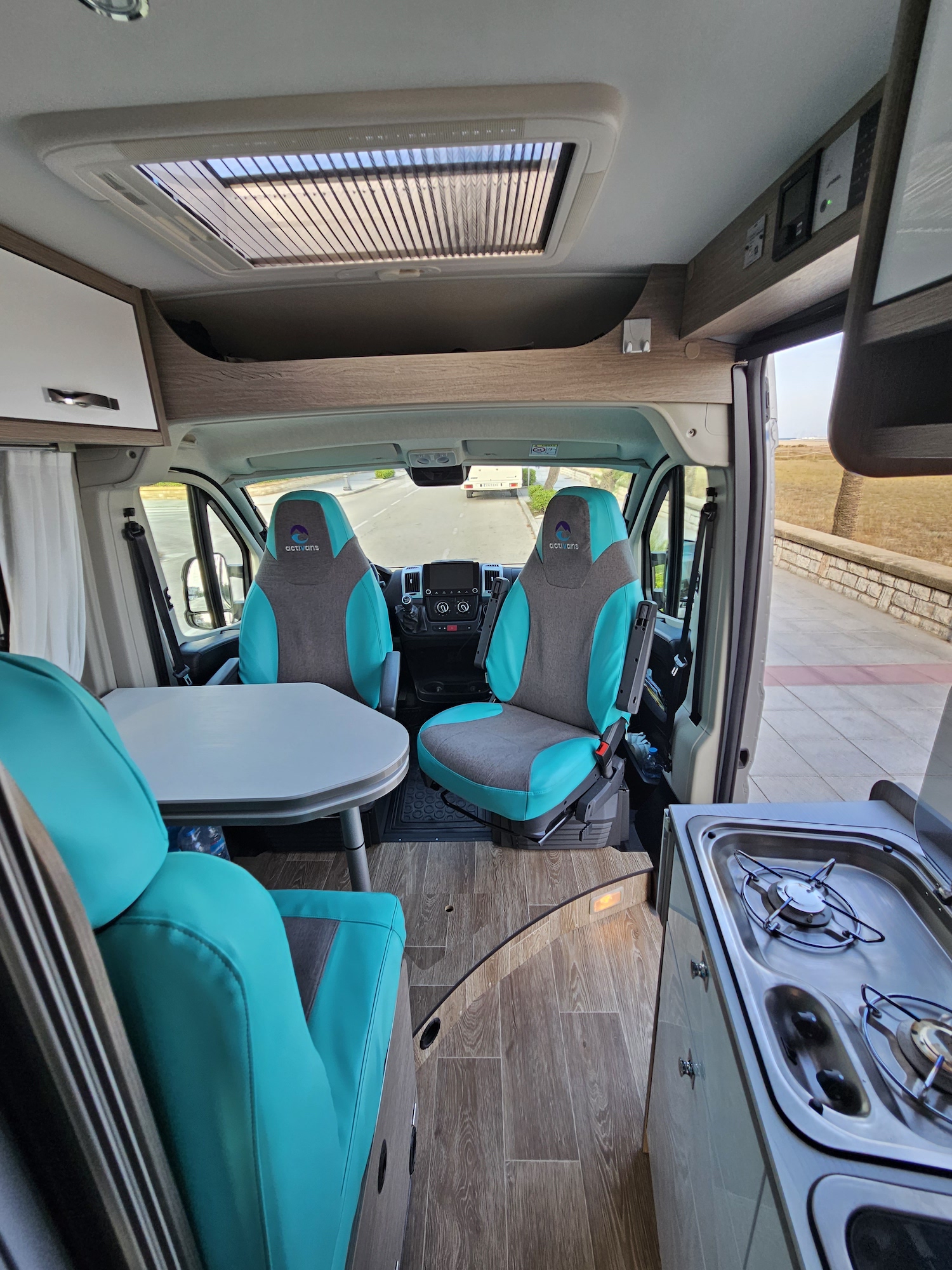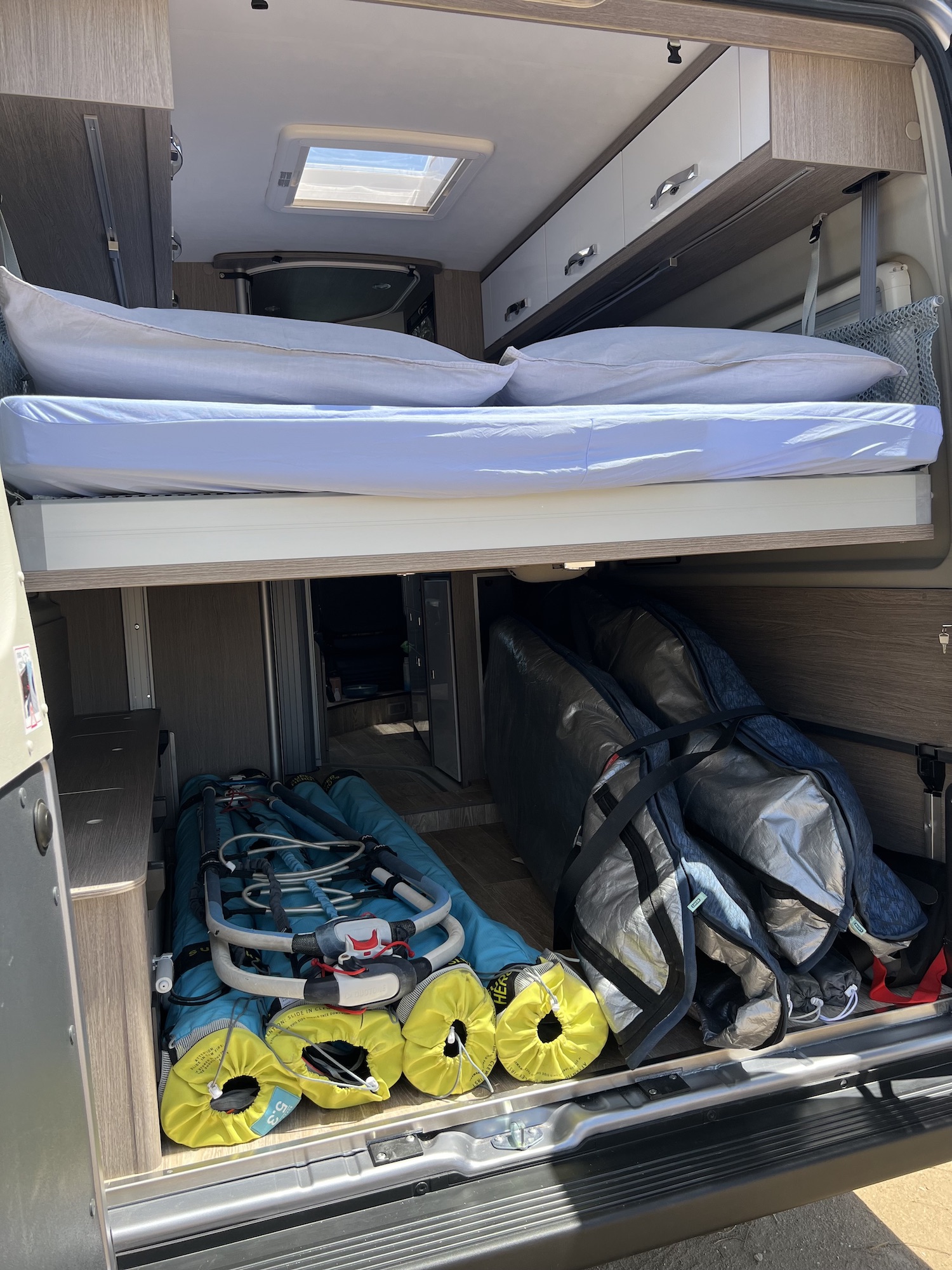 Let’s talk about these campervans – they’re like our windsurfing homes on wheels! They come loaded with all the gear you need to make windsurfing dreams come true. Picture a slick kitchenette, an oasis of hot water for your post-sesh shower, eco-friendly toiletries, and plush beach towels! And wait, there’s more, a king-sized 160 cm bed hiding a secret stash for all your windsurfing gear – board, sails, and all the accessories!