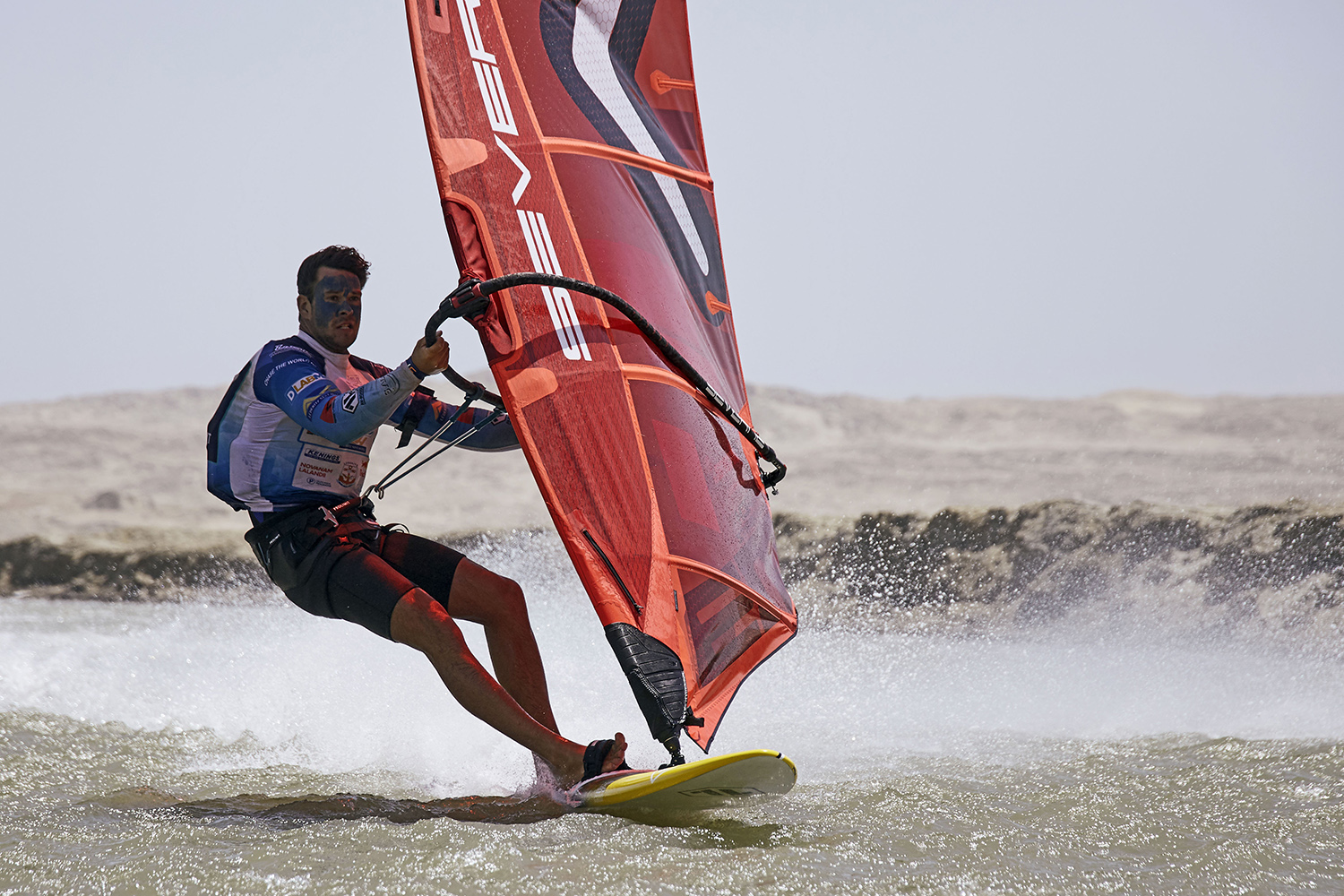 Just to give you an idea of the difference between an average rider like me and a real pro, I can tell you this story. In the 2019 Lüderitz Speed Challenge, conditions were almost perfect. It was my first experience, I had no fear and no regrets, and it was almost easy for me to break the 40-knot barrier and to reach 45 knots of average speed on a 500-metre course. But this time in the 2021 Lüderitz Speed Challenge, for the very first time, the wind came for all the duration of the event from a wider angle, so the wind generated a higher chop on the second half of the course, just while you were on a broad downwind reach, so you had to push more on the sail to keep it in front of you. The result was that in these conditions it was very easy to lose control. Many riders had big crashes and I did too! I had a big catapult! It was completely unexpected, super painful and I hurt my face. I completely lost my confidence and in the last few days of competition I was not able to sail fast, because being so scared to catapult again I lost all my confidence.