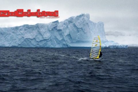 Thomas Miklautsch windsurfing in a surreal ice landscape in Antarctica in year 2000.