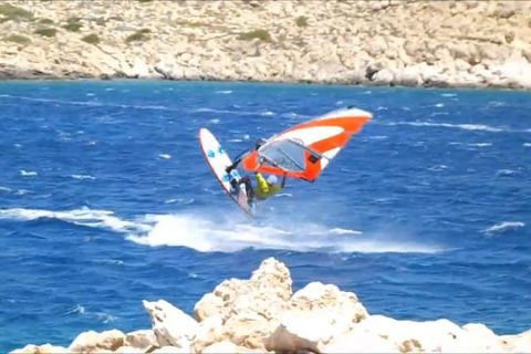 Rick Jendrusch perfoming in a heat of the European Freestyle Pro Tour windsurfing in Lanzarote. Video by Adam Sims / EFPT.