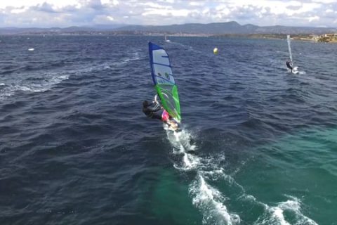 Freeride windsurf session filmed with a drone from La Cahute windsurfing school Le Brusc, Six-Fours-les-Plages, Var, French riveria.