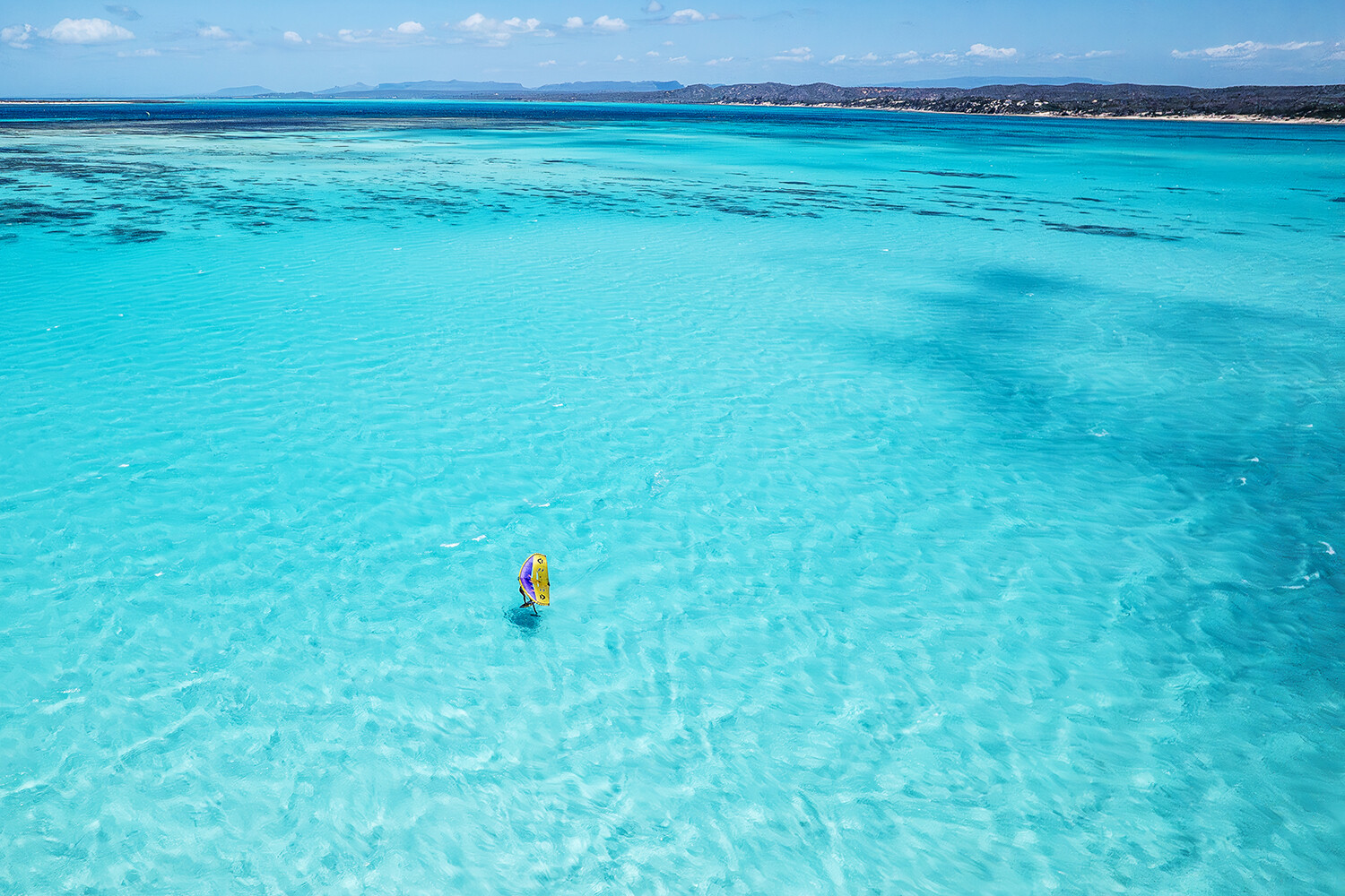 The wind is slightly lighter here than in the rest of the lagoon, and the water is incredibly flat, making it a paradise for freestyle, freeride, or slalom and ideal for those who are learning. At low tide, it becomes as smooth as glass!