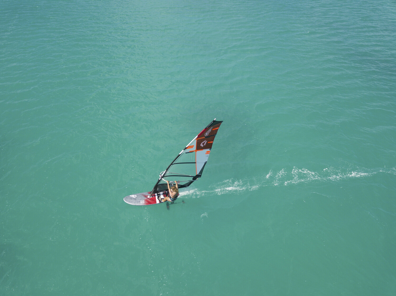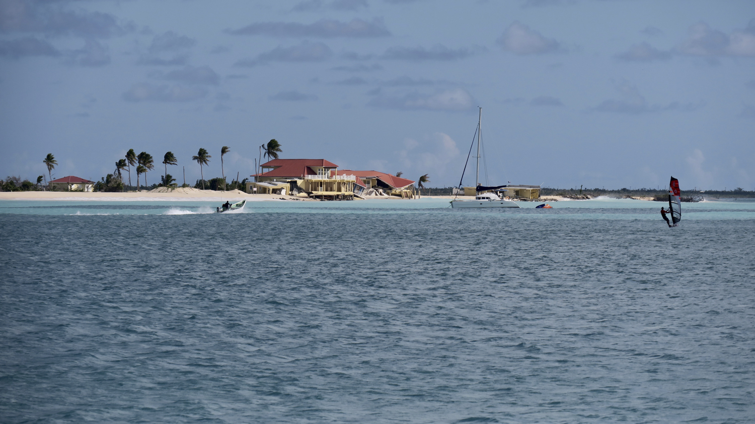 After a quick morning passage from English Harbour, 25 miles windward, we drop anchor at Cocoa Point. The beach here was previously reserved for hotel guests only, but today nobody forbids us access. Irma destroyed the hotel and only its foundations are left visible. Further up the beach, which is about ten kilometres long, another small complex remains abandoned. Horses and donkeys roam freely and the wind blows offshore across clear flat water. It’s an ideal playground for windsurfing and we cut through the turquoise blue water with only the whistling of our foils to break the silence.