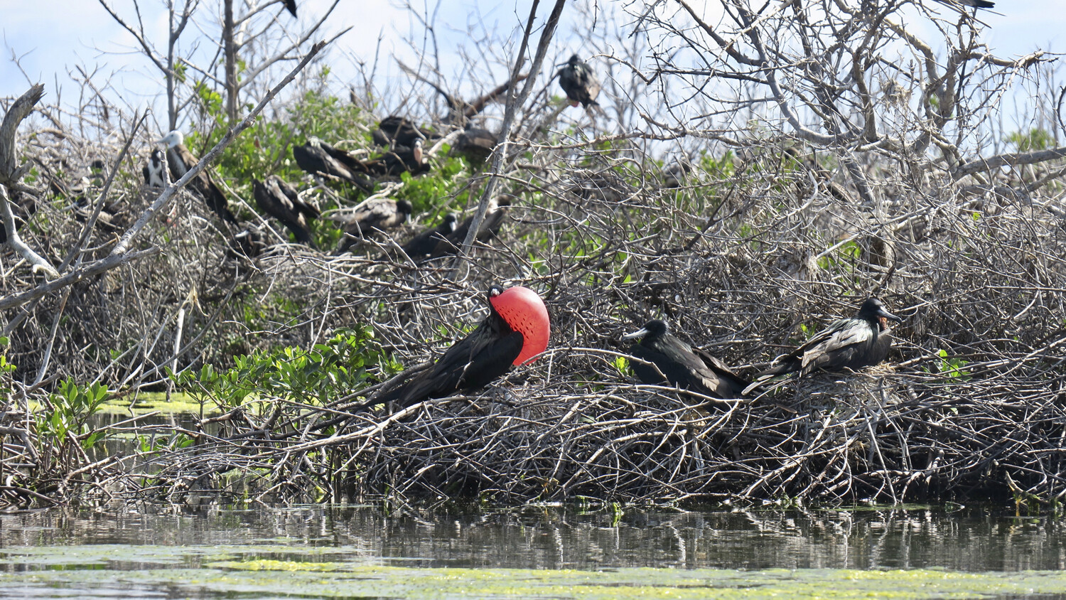 In the sky, thousands of black birds fly in big circles as we arrive in the ‘frigate bird’ sanctuary. The males immediately attract the eye with their red throats that swell like a balloon. Further down the branches of the mangrove are young frigates with white down, well protected under the feathers of their mother. The show is magical. These birds feed mainly on flying fish, hunting for them several hundred kilometres from the nest if necessary. We head back to the village to do some shopping at the small supermarket and eat a local dish of fish with Creole sauce, rice with red beans and plantains.