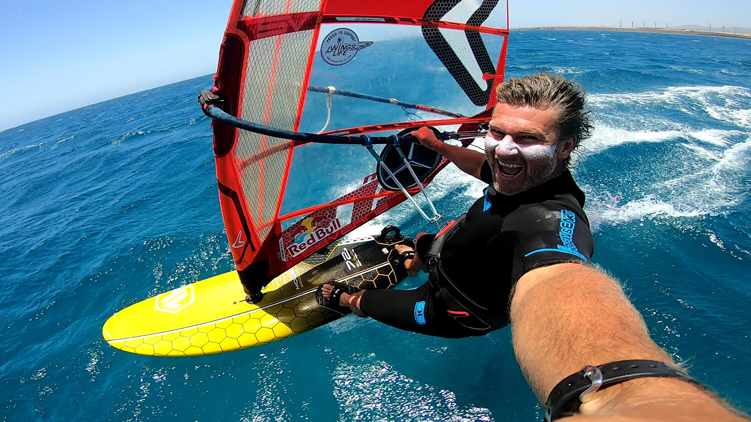 My tips for going fast are ‘close the gap’ and hold your sail still, controlling your board with your legs, as well as sailing off the wind, that is obvious!