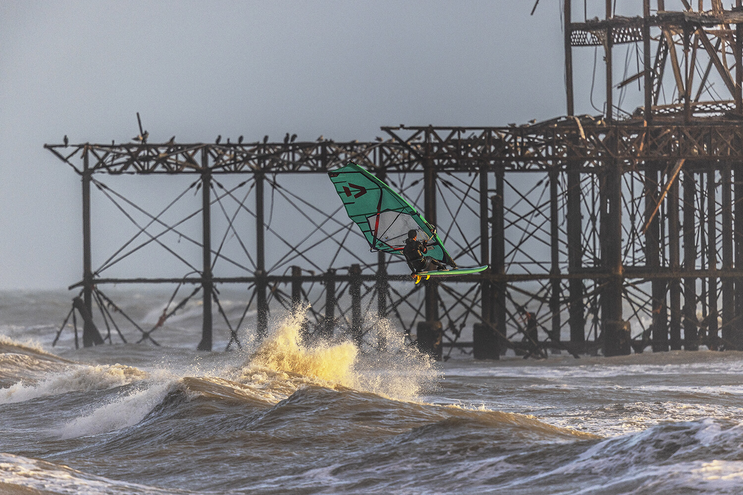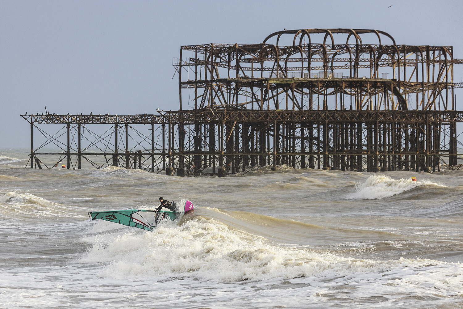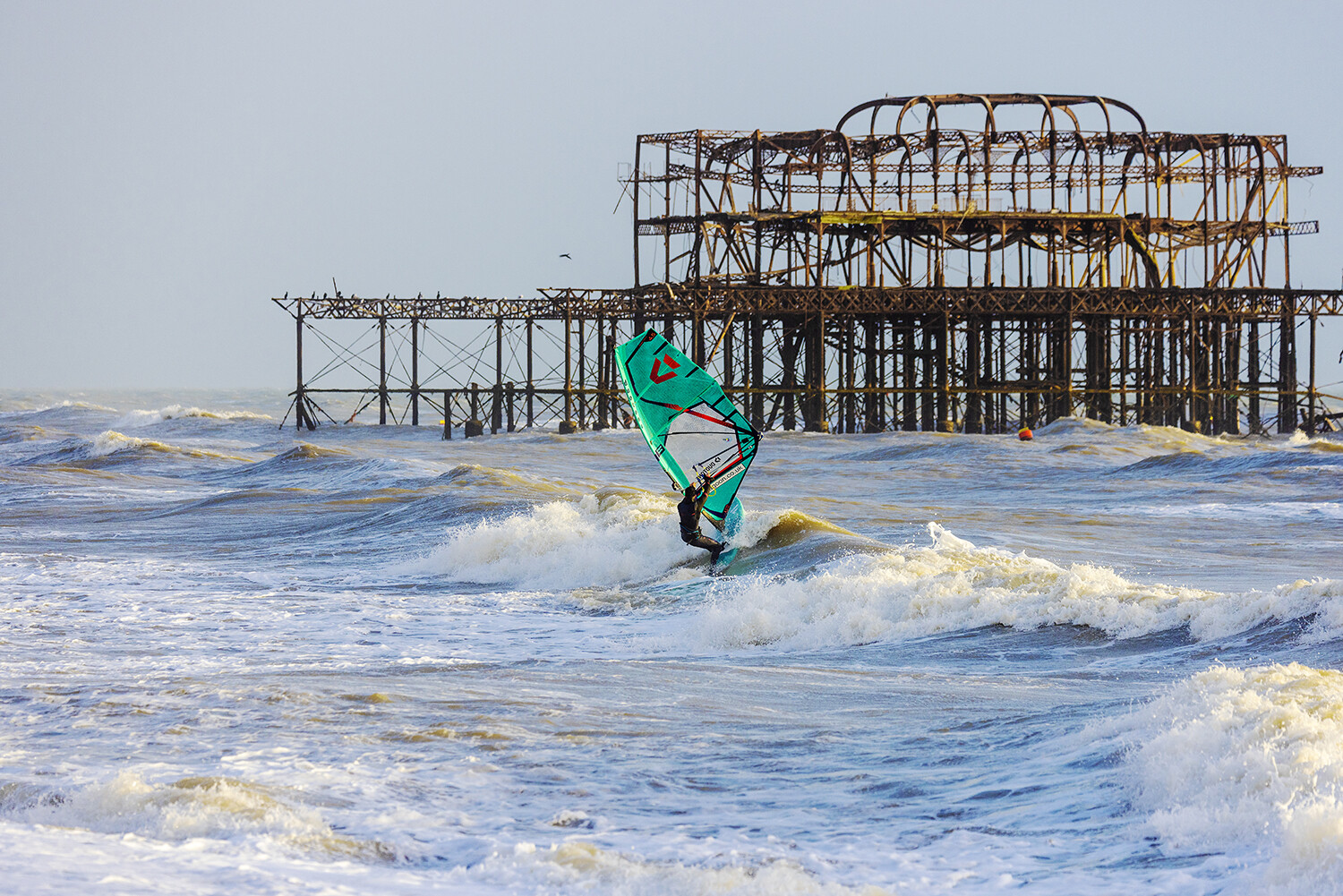 The idea was to get some pictures sailing next to the old West Pier in Brighton. Funny enough, I would call it my local beach. I can walk down from my house and in 10 minutes I’m standing looking at the West pier, but obviously, I’ve never actually sailed out there. It’s not normally the best conditions and on top of that the parking situation is really difficult. Windsurfers always sail up towards Hove, next to Hove Lagoon or even up at Shoreham and Worthing. Generally you get bigger waves down next to the pier, which results in a nasty cross-shore current, and the wind can usually be quite fluky, especially with all the buildings in the city.