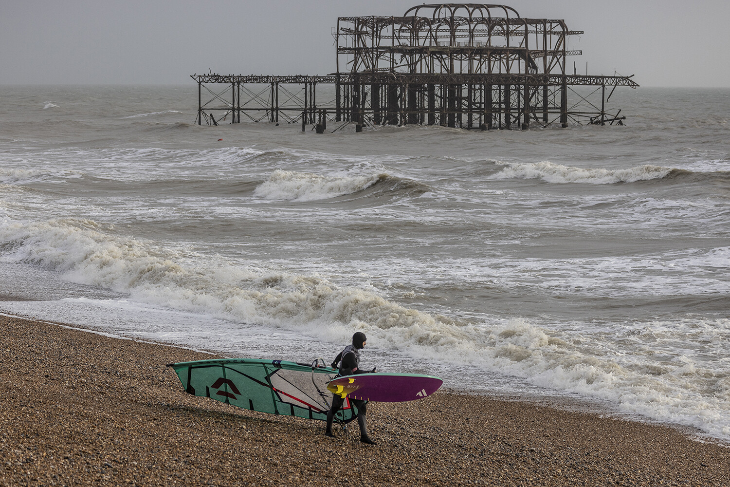 It’s Christmas Eve’s, Eve, (if that even is a thing); that time when most men are charging around doing their last-minute shopping before Xmas. I had received a message from Lucas Meldrum earlier in the week, letting me know he was at home in Brighton and if I was up for any windsurfing shooting opportunities that may arise. I have always been a fan of the rusty ruins of the old West Pier as a point of interest for windsurfing photos, so with that idea in mind, we made a rough plan to try and sail close to the ruins if the right forecast materialized. The last time I had been for a windsurf mission to Brighton to shoot the pier, was about five years ago, so it felt that the time was right for another bash. And lo and behold, a decent forecast appeared on the radar, with perfect strong westerly winds, just two days before Christmas. Now in normal times this would be a straightforward trip in terms of travel from the Isle of Wight to Brighton, but at the end of 2022, with rail strikes rife and the surge of people travelling before Christmas, anything was possible.