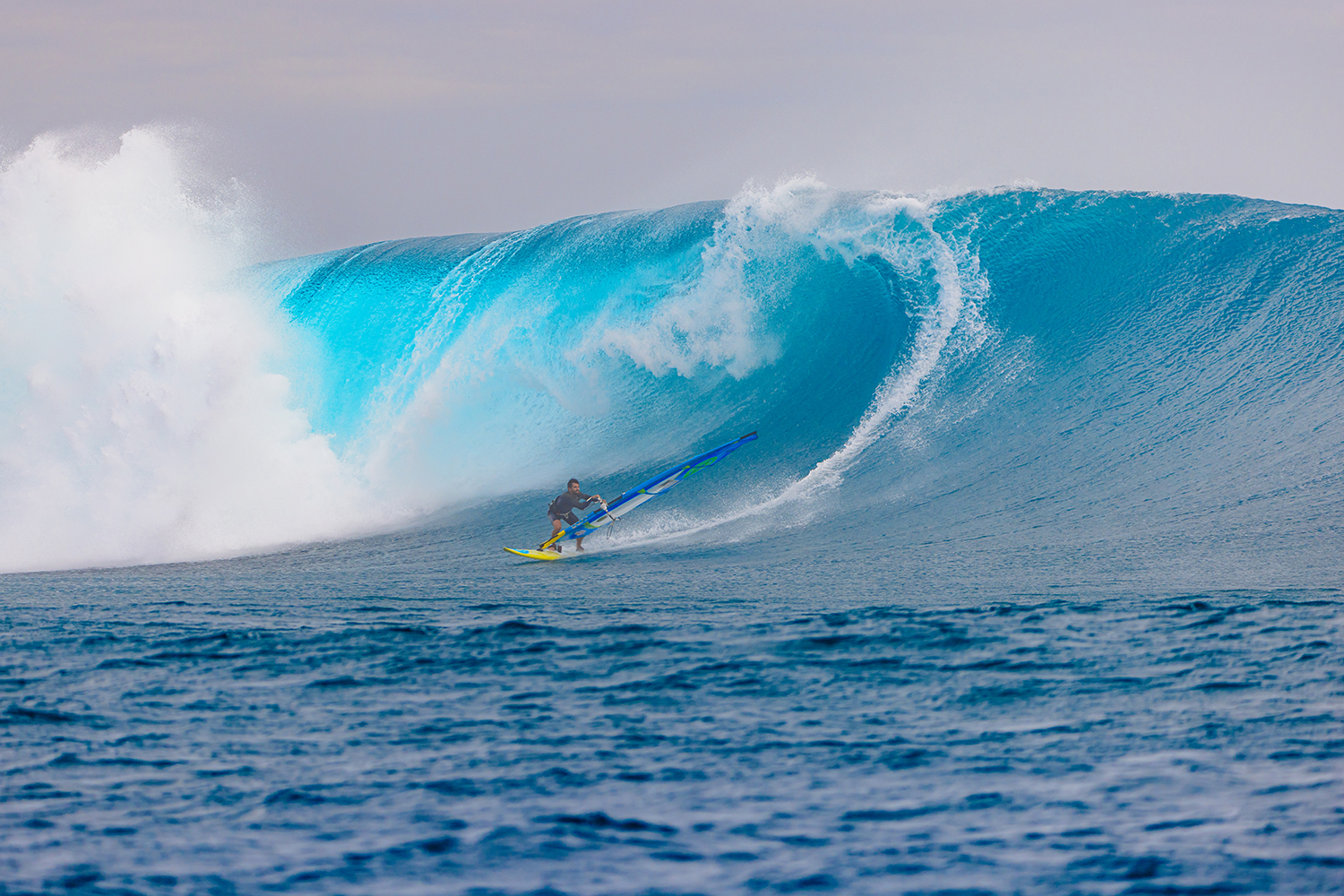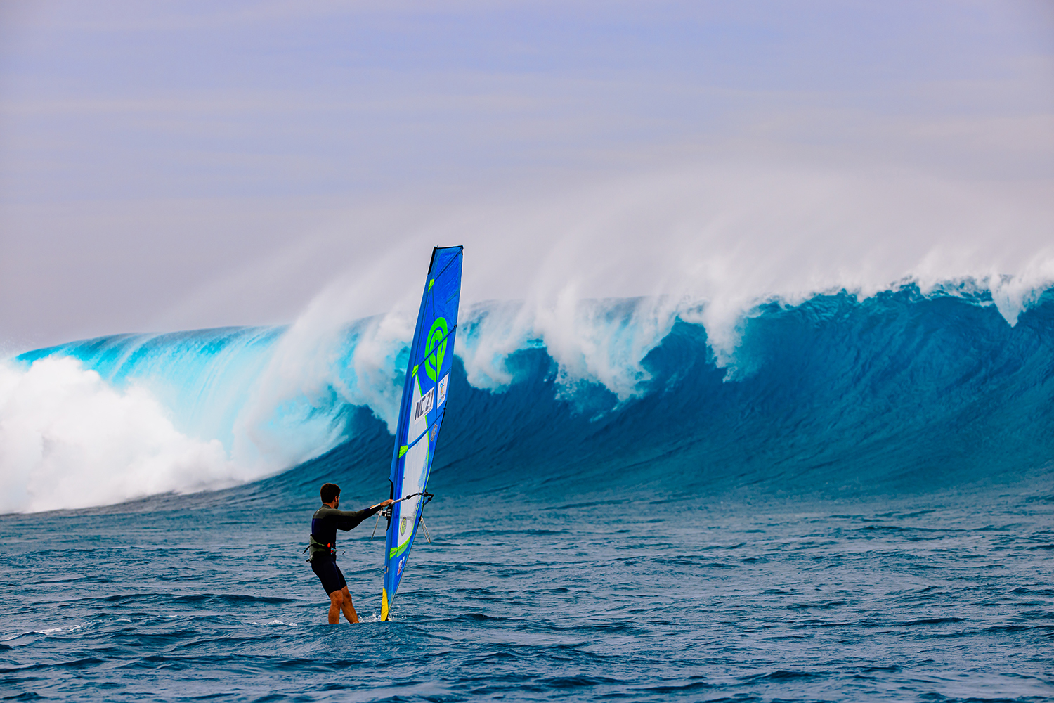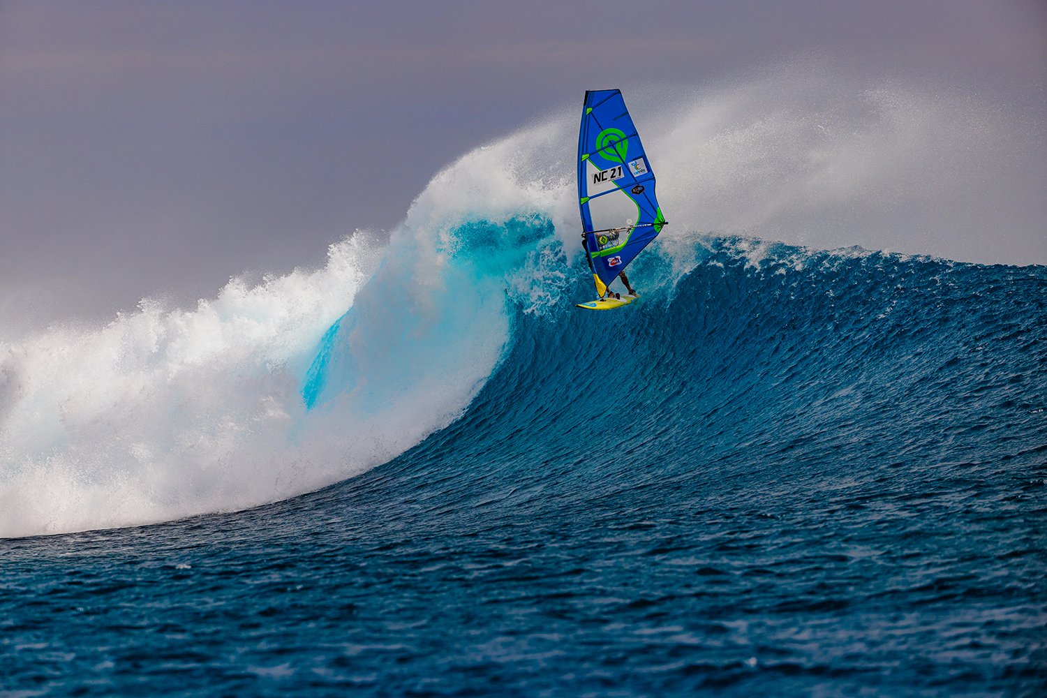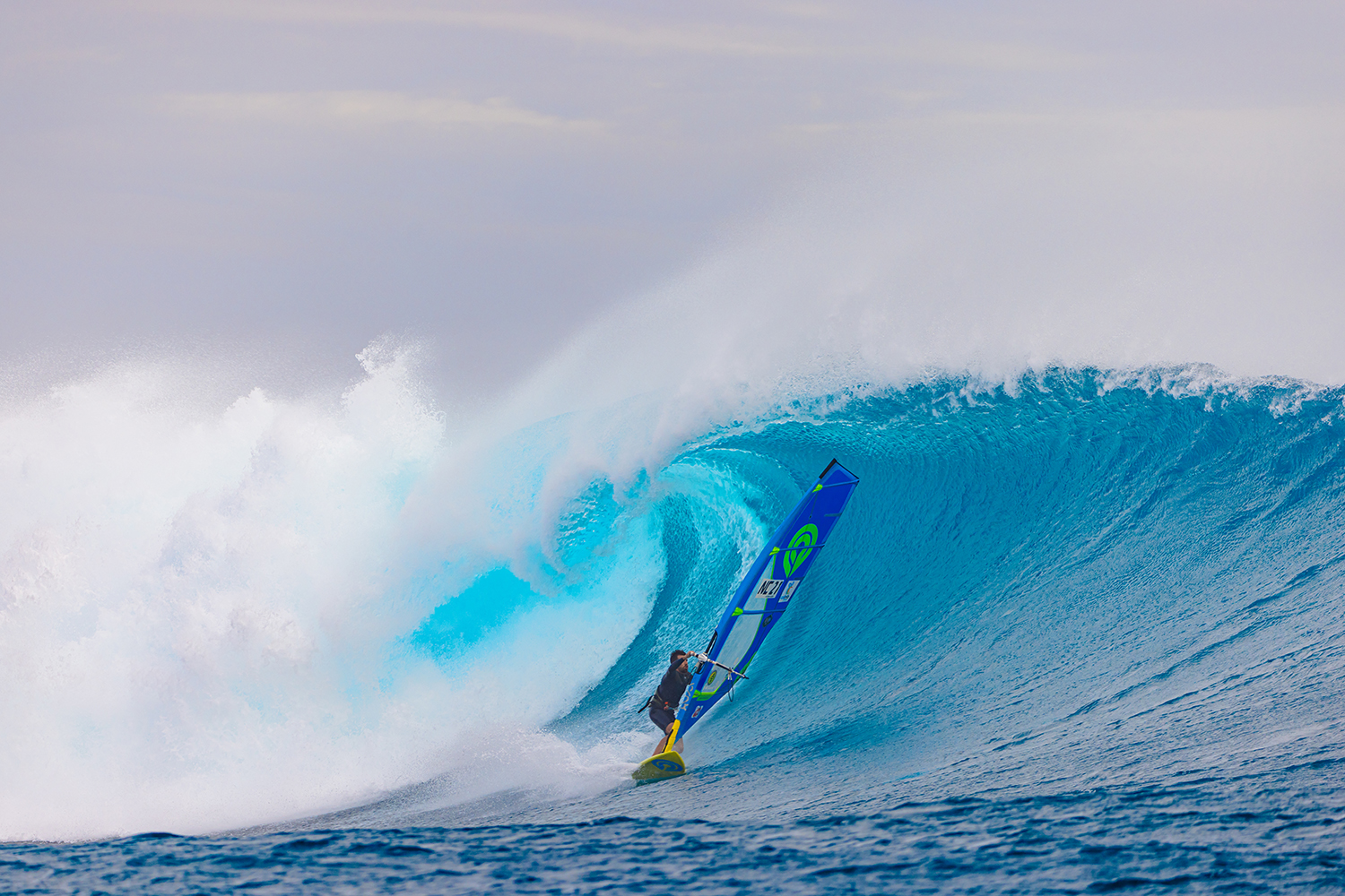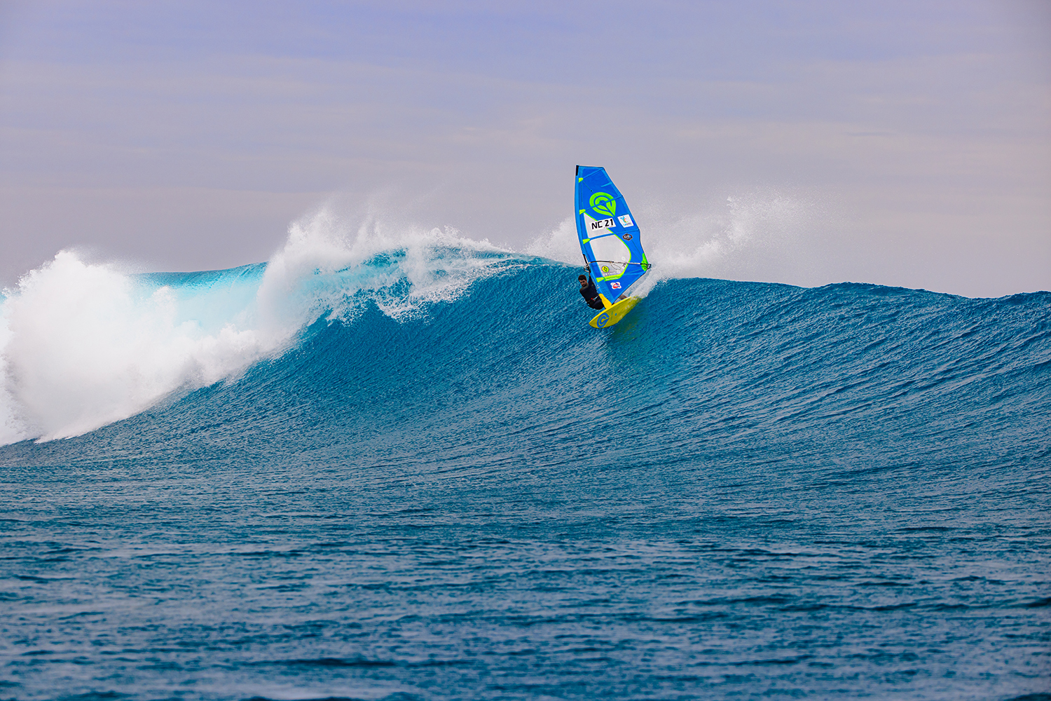 I rode a 70L quad made by Keith Teboul specifically for me to ride special reef breaks. This board works really well until it’s mast high, but when it gets over mast high it is actually a bit short. When it is big and choppy like this, I personally feel like I want more nose and a longer rail to be able to manage the chop and set the rail without nose diving. When it’s big you perform longer rail turns whereas when it is smaller and hollower you are more dancing in the pocket. I was using MFC fins, 13cm in the back and 9cm in the front. I was riding with my 4.5m Goya Banzai, which is the biggest wave sail I use. When the wind picked up I could have been on a 4.2m, but I stayed on my 4.5m all day long. When the wind picked up it was a little bit big – especially as you only need enough sail to catch the wave – as once you are on then you have more than enough power.