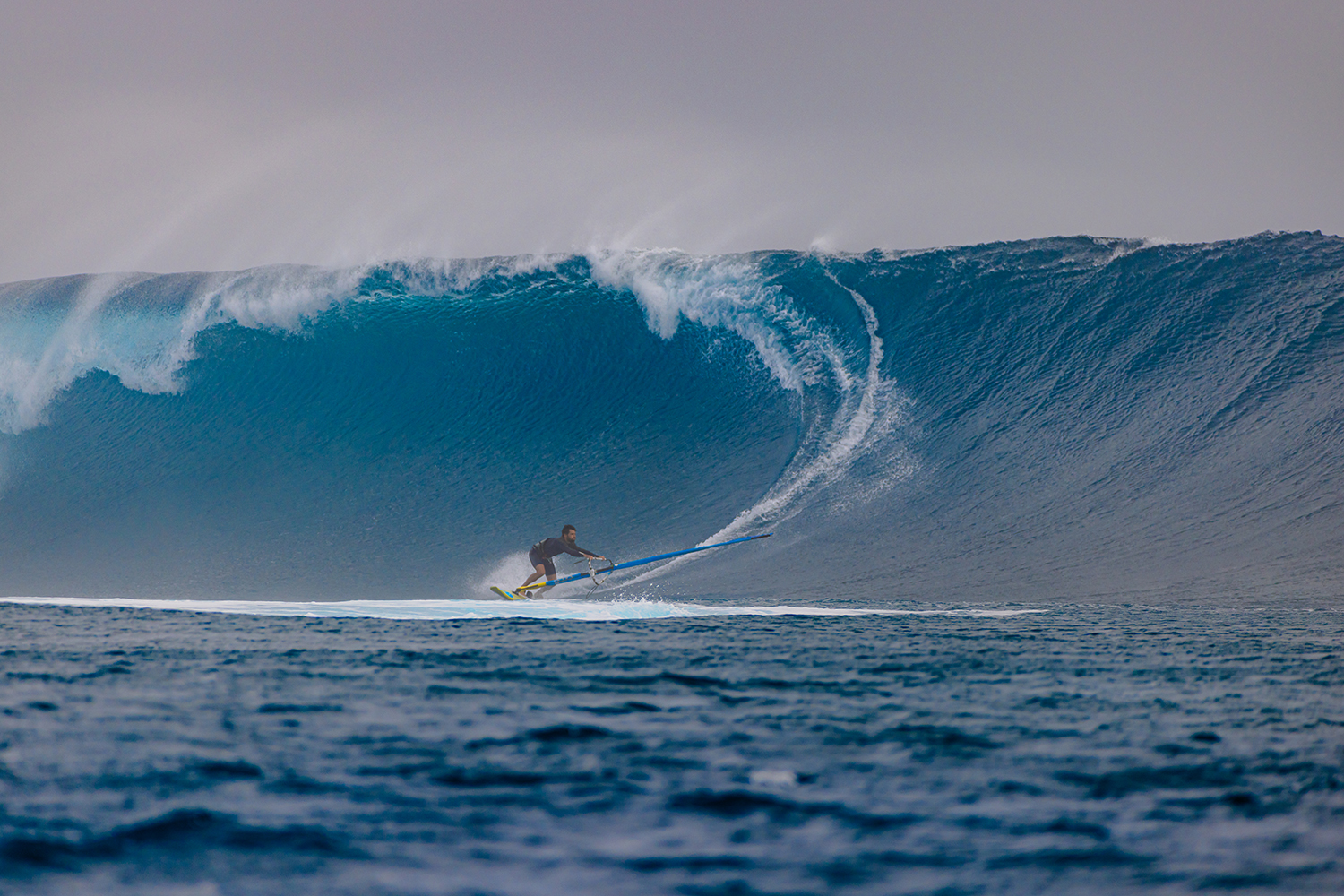 At this size, Tenia can be dangerous. It is a South Pacific swell, which I think are the most powerful in the world. Tenia is a reef break with live coral, so if you touch the bottom you can get seriously injured. At this size it is a technical wave, but I think Cloudbreak is a bit faster. Tenia can be a bit choppy, which makes it suer tricky to ride it properly. The channel is about sixty metres deep, so it never closes out. In this sense it’s a bit like Jaws. However, riding the wave and performing on it can be difficult. It can be so fast, and with even the slightest bit of chop, you bounce quite quickly on the wave, which makes it super hard to set the rail and perform a proper turn. My goal is to always try and perform as well as I possibly can on those massive waves. To be perfectly honest, it is scary out there. When you have up to double mast high waves behind you, essentially chasing you with speed and serious power, you don’t want to crash. My friend Ivan got caught by a monster set and was held down for a long time. When he popped up, he still had to take the rest of the set on this head, which was tough for him, but thankfully, everyone survived.