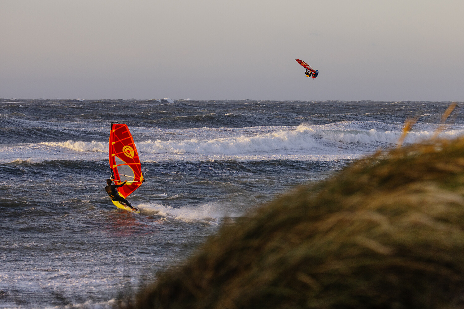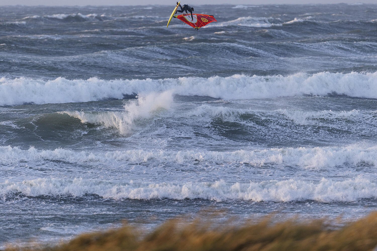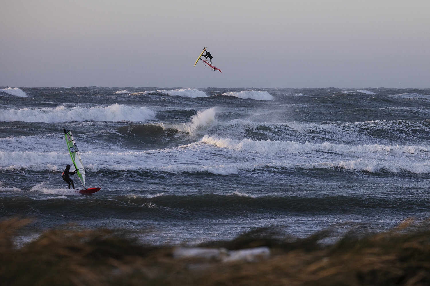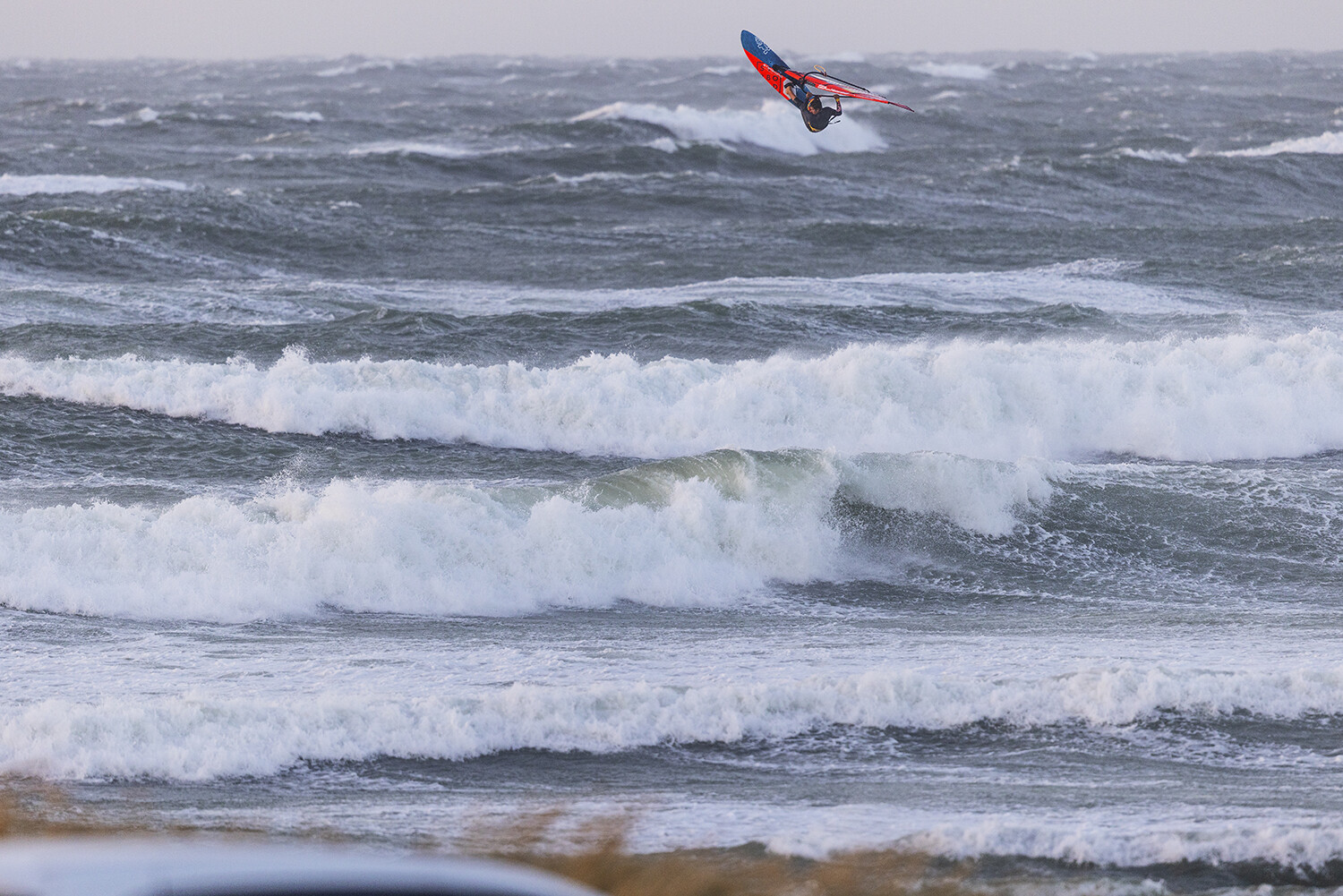 If you have ever witnessed Liam and Marino sailing, then you will know they always go full power and going big is the only option especially in these extreme conditions. From the moment they hit the water I already had the feeling that something special was about to go down. The light was glimmering though the clouds, the wind was probably blowing 40-50 knots and there were logo to mast high ramps just beckoning for rocket airs. Marino opened up with a monstrous back loop, easily clearing the horizon from my vantage point sheltered in the dunes.