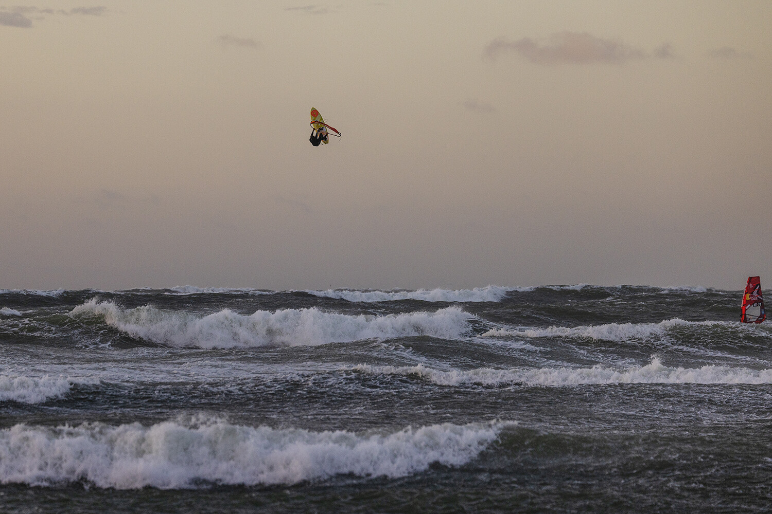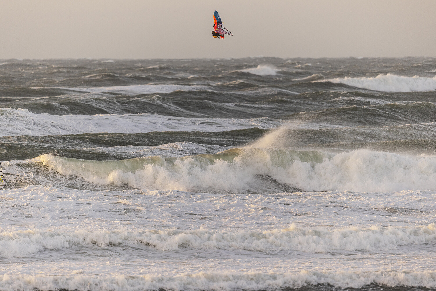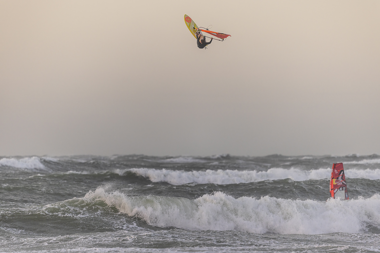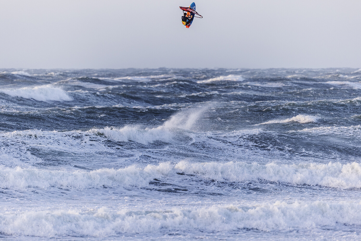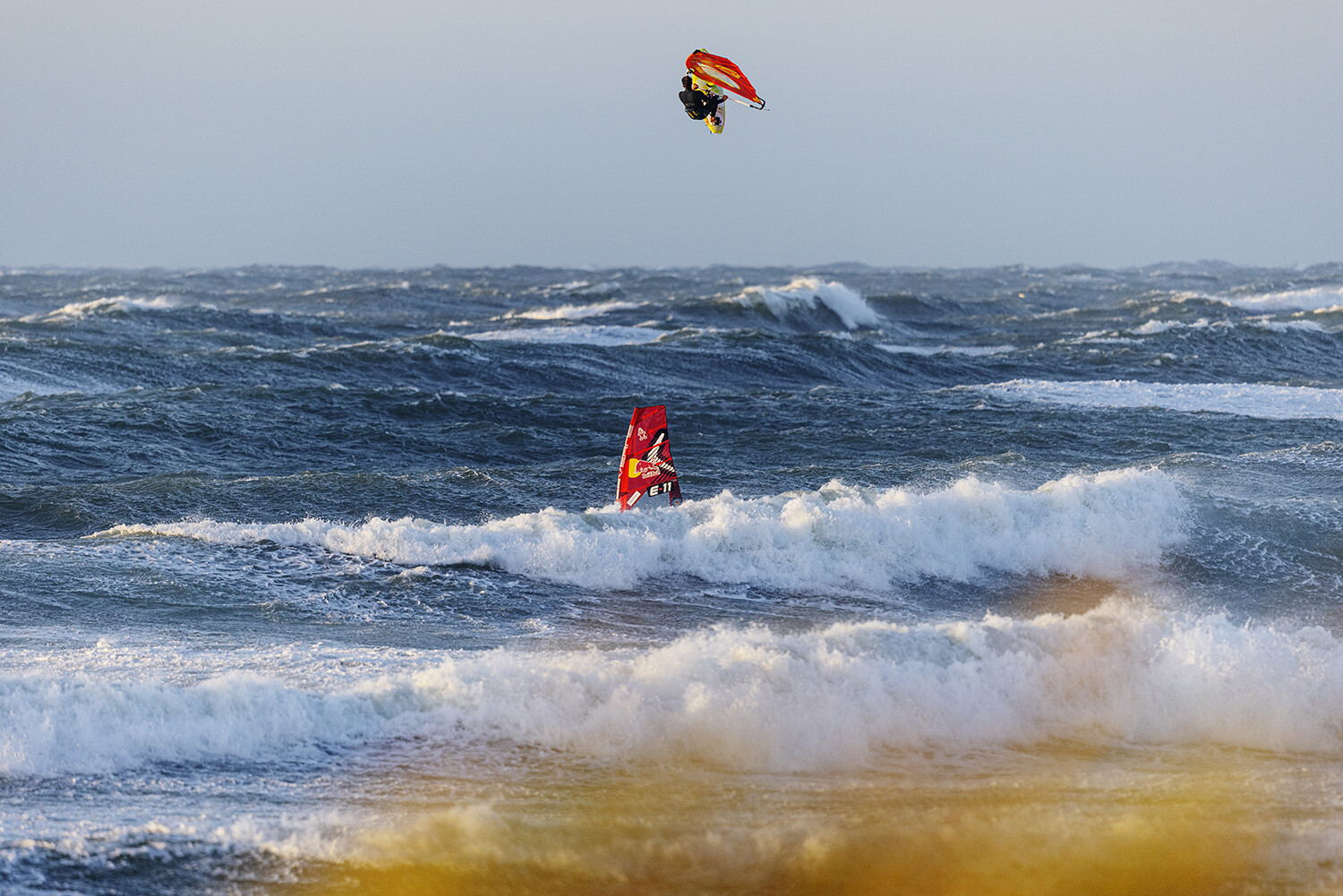If you have ever witnessed Liam and Marino sailing, then you will know they always go full power and going big is the only option especially in these extreme conditions. From the moment they hit the water I already had the feeling that something special was about to go down. The light was glimmering though the clouds, the wind was probably blowing 40-50 knots and there were logo to mast high ramps just beckoning for rocket airs. Marino opened up with a monstrous back loop, easily clearing the horizon from my vantage point sheltered in the dunes.