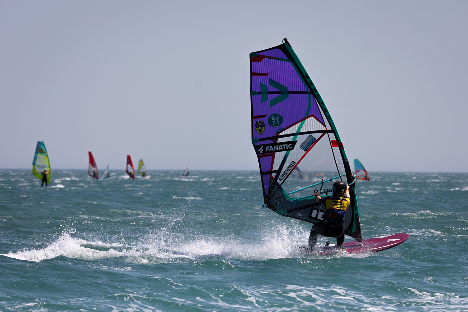 Our plan was to arrive a day early and have a sail and run the course, but that didn’t happen. A few hours sleep and it was up and off to the briefing, ready for the 1st race. With the one hour countdown set, it was time to rig. It was absolutely blowing boots with the Tramontana in full swing, so I opted for a 5.2 GA Vapor slalom sail and 61 cm wide 98-litre Tabou Manta, and 30 cm F-hot fin. With 1400 other people on the water, the wind was so shifty and patchy and the water state was horrific. As it was my first ever Défi Wind I didn’t know where to start, pin or boat end. I opted for pin, but was so late to the start as what I thought was the start boat, was actually the finishing boat.