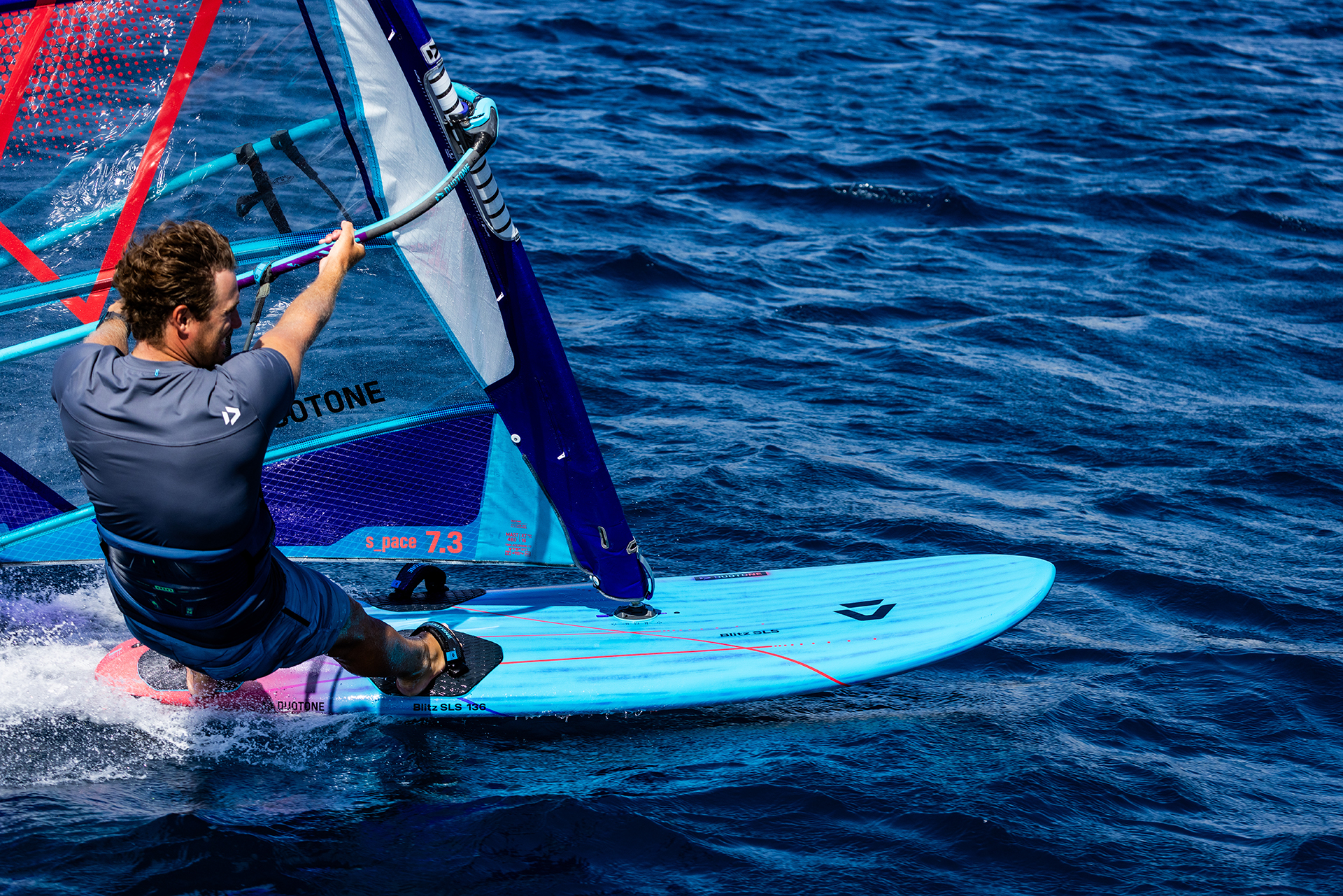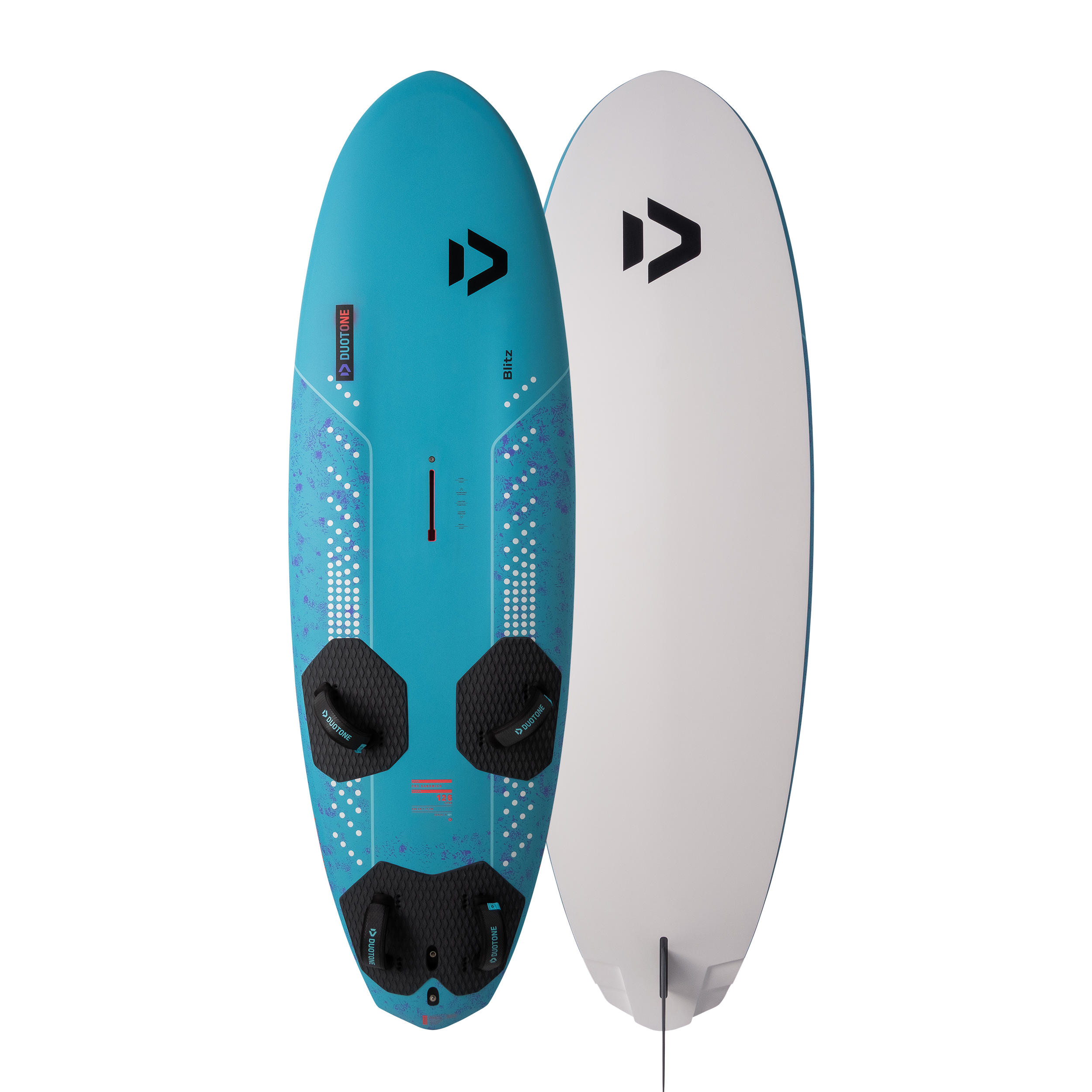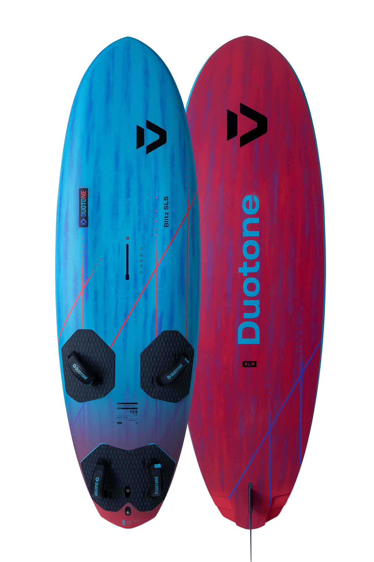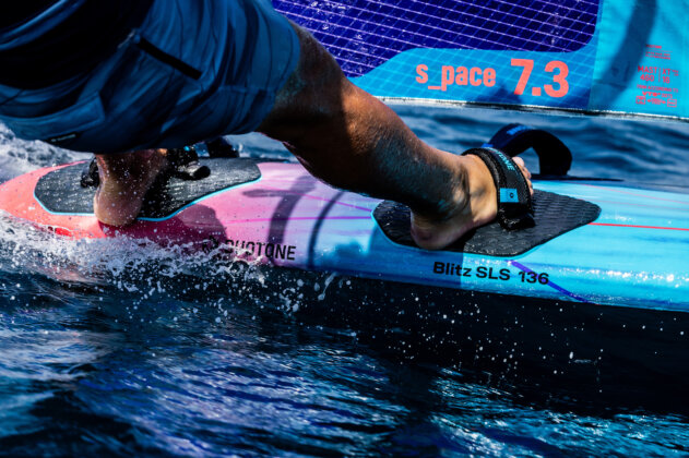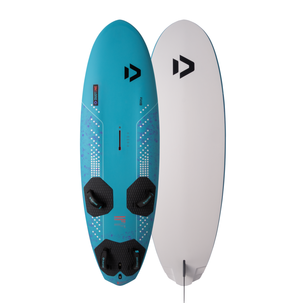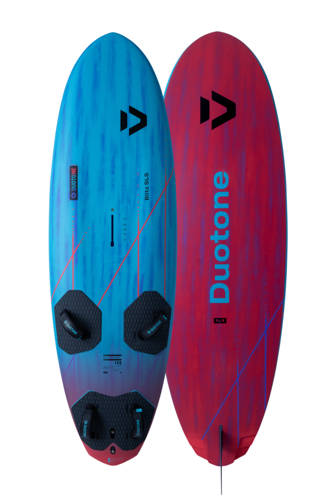 The Blitz SLS can be gybed aggressively in experienced hands, yet also feels easy and smooth for intermediate riders. The racier/boxier rails and a further outboard strap position allow the rider to push harder and let the board fly over the fin for increased top speed.