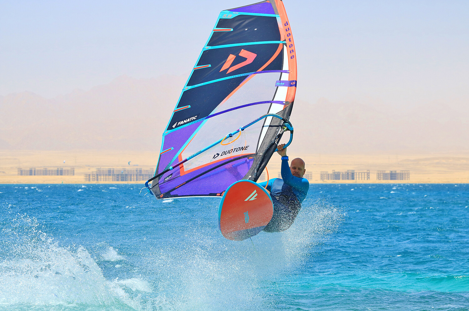The increased batten density at the top of the sail is a real asset as the breeze builds. The sails tuning range is truly exceptional, allowing the rider to crank on the downhaul without causing leech flutter or instability. This ensures that the rider can confidently lock in at speed as the Duke really encourages the rider to commit hard to the rig when the pressure hits. Through the manoeuvres, the sail has a clear on/off feel. Sheet out with the back hand, and the power shuts off instantly, producing a light and free feeling through the turns. On the exit of the gybe, draw the back hand in to receive the power back and accelerate onto the plane.