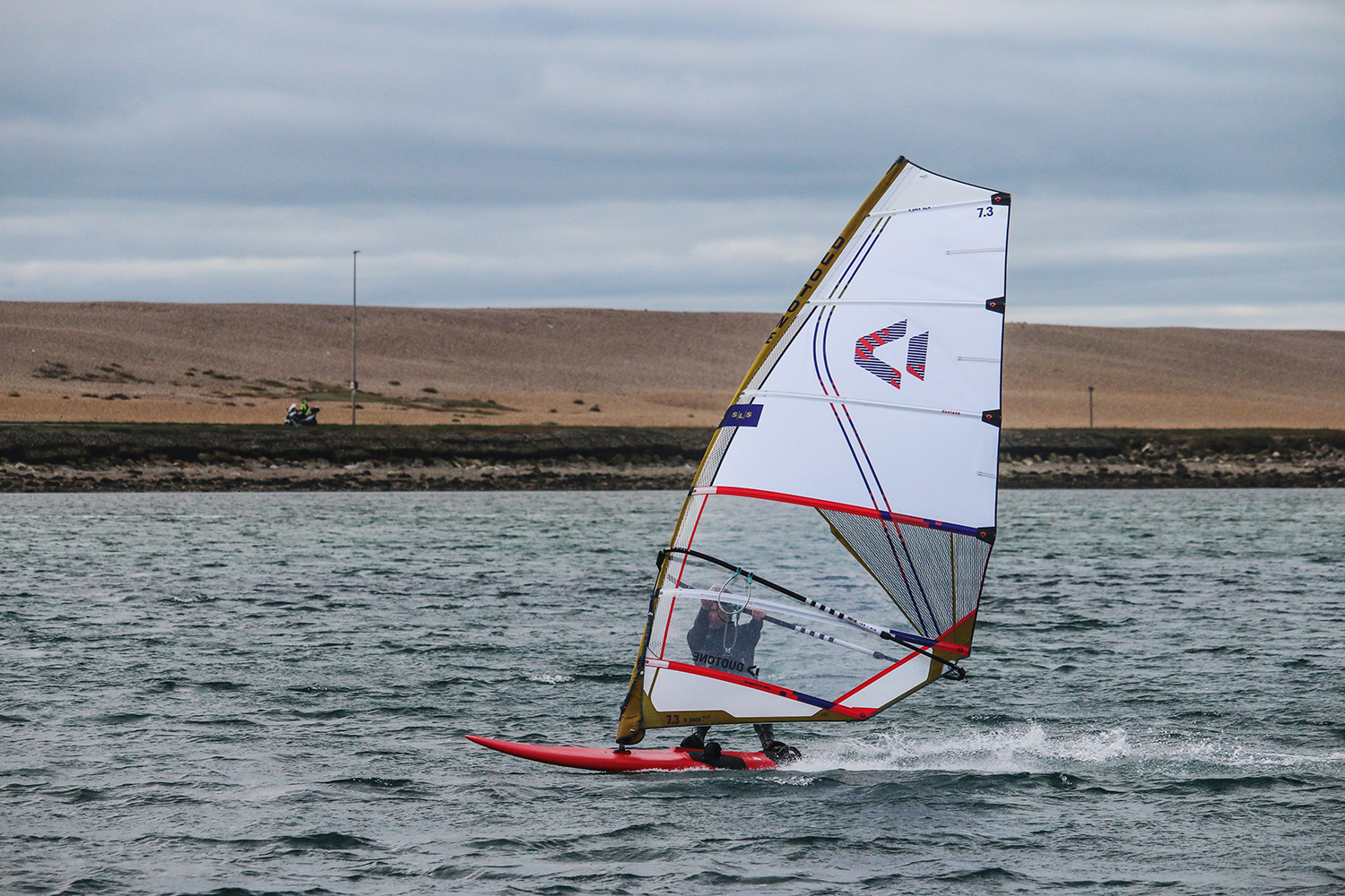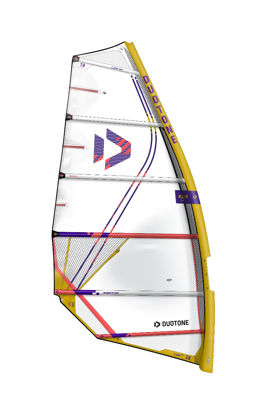 In your hands and walking down the beach, the E-Pace feels smaller than its quoted 7.3m size thanks to its short boom, which helps to make the sail feel compact. At rest the E-Pace sits flat, but that instantly changes as soon as the belly of the sail fills with wind to deliver punchy power with a distinctive forward pull that you would usually experience from a cambered sail, helping you to drive whichever board you are riding onto the plane, while allowing you to slot back into the straps in complete control. When perfectly powered, the E-Pace SLS feels light in the hands and will do a lot of the work for you, which allows you to focus your attention on what lies ahead. Comfortably powered, the E-Pace SLS remains stable at speed and urges the rider to push as hard as they dare. Meanwhile, through the lulls, the E-Pace SLS low-end performance is impressive with its natural draft sat low down, while its straight luff curves offers more feedback and spring when working the sail a little harder. The E-Pace SLS will definitely get you up and going before others on the water and I dare say that you could possibly rig a size smaller than others on the water. Pushing the boundaries of the E-Pace SLS in gusty conditions, the E-Pace SLS does require some essential tuning to keep the power stable to ensure you remain in control. The E-Pace SLS also begins to feel a little big and weighty when overpowered with its lower leech holding onto a lot of the power, however, quick and careful tuning will eradicate this and it is definitely a sail you rig for the gusts. Through the gybes, the E-Pace SLS punchy power is a welcomed personality trait, sending you into the gybes with as much speed and power as you dare. It then pulls you out of the gybe with gusto, giving you every chance to exit fully planing. Rotating the rig is a delight as when the rig goes neutral, its smaller-in-the-hands feel returns for an effortless and easy transition and rig flip. Rigged for the upper end of conditions, the E-Pace SLS offers real usability with easy to find power and pace that will give you the opportunity to challenge at the front of the pack.