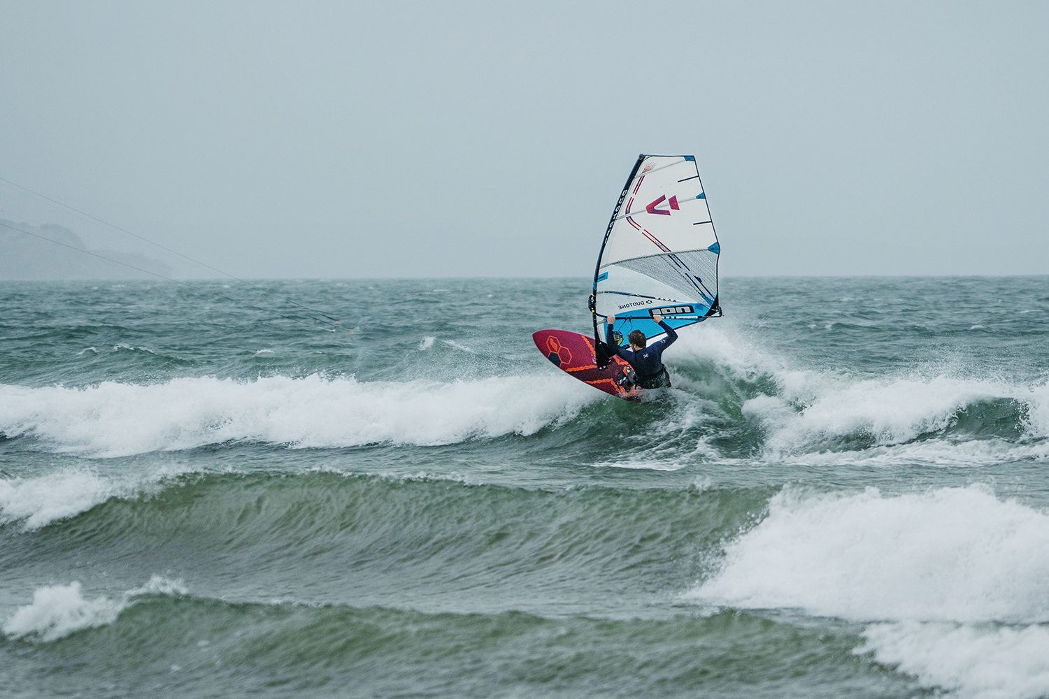Duotone’s high-end wave sail. When unrolled, you can see the fibres and detailed layup, which gives it a slightly industrial look, but in a good way, allowing you to appreciate the inner workings that aren’t always visible. At the foot, a 6mil X-Ply layer is strategically placed for added protection in an area prone to stress from both the rider and the conditions. Most notably, the Carbon X-Ply radiates from the clew, running diagonally up and across the Super Hero D-Lab. This Carbon X-Ply is there to eliminate the stretch in the load direction, extending the sail’s lifespan and helping to transfer load from the clew into the Super_Hero D-Lab’s body more efficiently. On a race sail, carbon battens are usually used for top end control but for durability reasons this doesn’t work to well on a wave sail. So, Duotone have cleverly placed epoxy battens to form the skeleton of the Super_Hero D-Lab. The epoxy battens are known for being extremely stable and more resistant to breakage, ensuring stable power delivery to the rider. The batten pockets are then made from carbon X-Ply to elevate its top end control, much like a race sail. As with every Duotone sail, there are clear indicators for rigging and tuning in the relevant areas, helping to avoid any faults during the setup process. Despite all this reinforcement, the Super Hero D-Lab is impressively lightweight—it’s the lightest sail in the test, they haven’t reduced the thickness of any of the materials, or reduced the sails integrity, they have shaved off the weight very cleverly in other areas. Its fused and glued seams contribute to this massively as well as it clean and tidy look, in fact approximately 90% of the Super_Hero D-Lab it fused or glued, including along the batten pockets. With its combination of light weight, design features, and performance materials, it promises to deliver an impressive wave sailing experience for riders looking to push their limits.