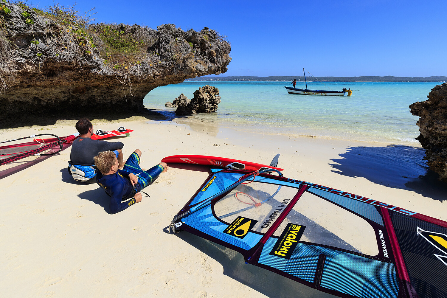 Bellies full, we leave the lodge to discover the jumping spot off the Torek islet, 500 metres south of where we were the previous day. The wave is weak, so difficult to ride, but perfect for jumping! The long period between the waves and their weakness enable anyone to evolve and grow comfortably and without stress, whatever their level. After ten minutes of riding next to the shore, we end up in the more “hardcore” spot, where we were the day before. We enjoyed some more quality wave riding, with waves slightly weaker than the day before but still fun! The lunch break organized by Angelo and Jean (the windsurf/kite instructors of the lodge) takes place on the beach of Diego Suarez islet, welcome to paradise!