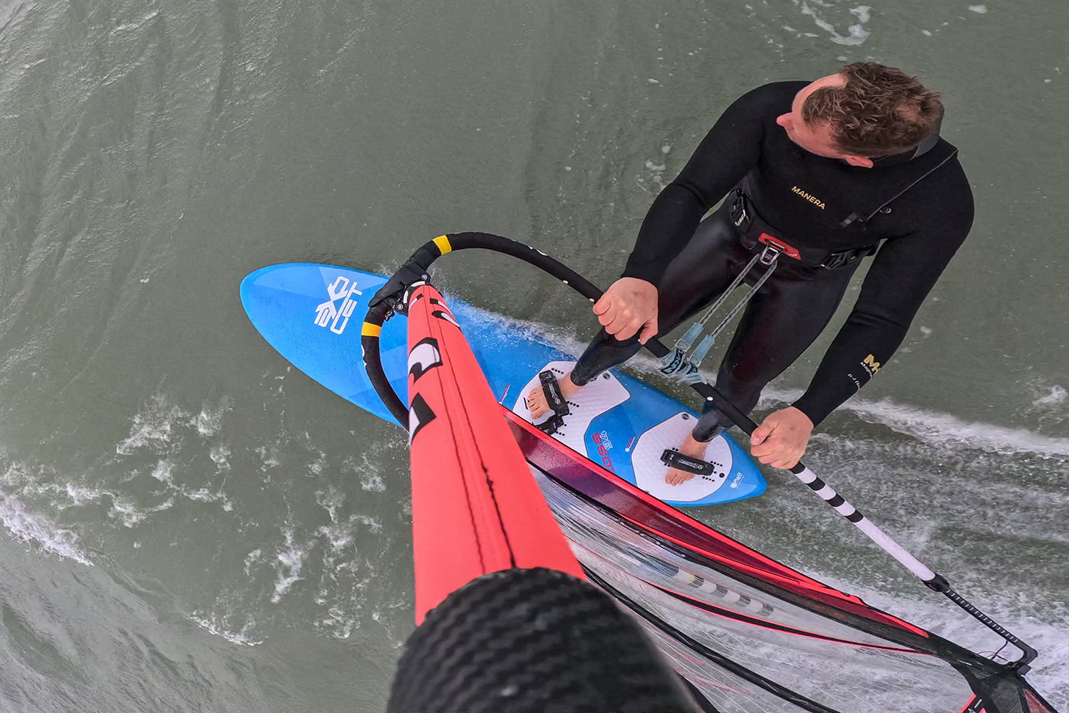 Up and off the beach, the Cross feels instantly stable. Its favourable volume distribution creates a very usable, stable, and directional platform. Not requiring huge input from the rider to generate forward motion, the Cross builds speed and slips onto the plane with ease as its early planing characteristics shine. The footstraps are easily found, and immediately the Cross feels fast. Regardless of the fin or footstrap configuration you choose to run, the Cross always remains locked in at the tail. Its impressively fast personality requires the rider’s attention, especially when blasting in more challenging conditions as you work your way through the chop. Despite its flatter rocker line, which makes it fast, its nose manages to avoid any unruly chop, which would otherwise hinder your speed or blind you with spray. Its wider tail outline around the straps helps carry you through the lulls, as well as assisting with carrying speed upon landing from catching some air time. Transitions are made comfortable with the volume and the speed it carries in the entry of both tacks and gybes. Due to its naturally speedy nature, the Cross likes to be commanded through the gybe, as well as enjoying a drawn-out radius. On a wave, this translates into the rider needing to ease off some of the power and let the board’s natural ability to carry itself shine through, so you don’t outrun the wave and potentially miss a critical section or a hit on a one-hit wonder. Arguably, you have to sail the Cross a little more tactically and play to its strengths to get the most out of it in classic onshore conditions. There is an ability to play the back foot to tighten up turns and then re-engage the fast and speedy character of the Cross. Capable of crossing over into different conditions, the Cross will deliver, especially if you are seeking speed and usability at the top of your wants list.