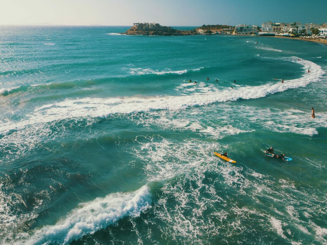 St. George Beach (side-onshore from the right) is one of the only spots with a flat water lagoon and a reef with waves on the outside, perfect for freestylers, beginners and all levels. Other spots along the west coast of Naxos which work with north wind are (from the north to south first) – Agios Prokopios (offshore), Plaka (offshore), Mikri Vigla (side-shore), Glyfada (side-offshore), Alyko (side-shore) and Pyrgaki (offshore).