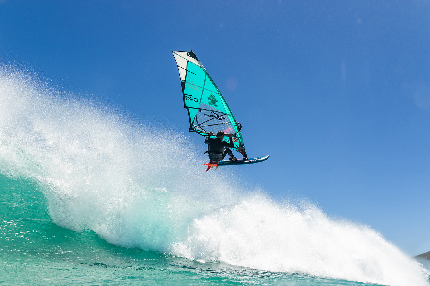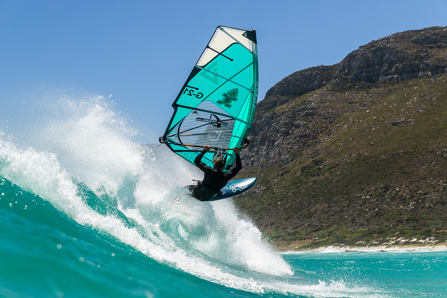 The trick is to switch off your brain for a moment and use your intuition. Focus on the moment; be peaceful and relaxed like doing a normal jibe. The best moment to really go for the bottom turn is a crucial decision and varies according to wave size and speed. Stay high on the shoulder of the wave and look through the sail to see how the wave slowly starts to build up downwind of you. At the last moment, just before the wave starts to break, go into the bottom turn, dropping with full speed from the highest point of the wave. Remember, speed is always your friend when riding a wave. The faster you are, the more freedom you have to adapt to the wave, presuming that speed comes along with control. As a beginner, it’s easier to start riding the wave a little earlier and then slowly adjust the timing to what feels comfortable. In order to boost your confidence it also helps to really get yourself worked by a small wave on purpose. After a few controlled wipeouts you know how to handle the situation and that there is nothing to worry about. That takes away the stress and anxiety. It’s important to create a situation where you learn within your own boundaries step by step.