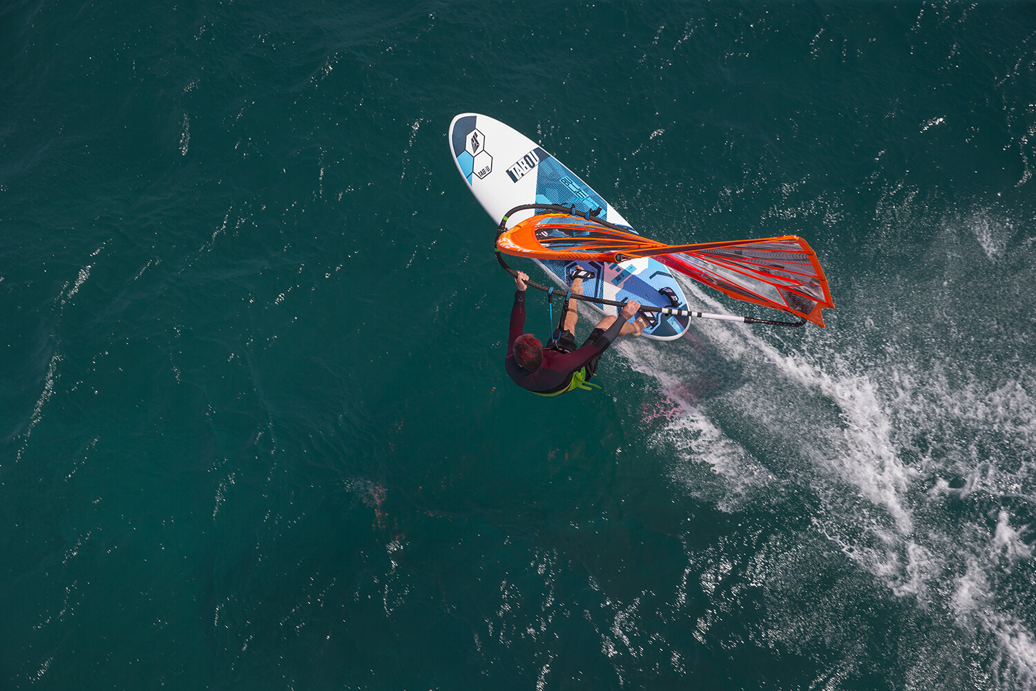 Theoretically we could have a lot of new technologies to build superior sails, but the main factor limiting this is the cost. A windsurf sail cannot cost 3000 euros! Nobody would buy it. If you look at the America’s Cup, they have unlimited budget and those sails cost tens of thousands. You cannot compare it. I would say construction is the area where big changes could be made! We are still using the old method of sewing the panels together in an ancient way. It depends on the cost efficiency, but it will come for sure. Potentially we could be sticking the panels together (glue) or even moulding them in one piece. Theoretically for the performance of the sail we could become super light with the modern materials, but on the other hand if they are getting too thin we will have big issues with chafing and durability. The trend in the past years, which I think will continue into the future, is more performance, but at the same time having sails that are easier to use with a bigger range. That is the main goal. In the past you had a very narrow range of use with a sail, but now you don’t need that much equipment to go sailing. If you don’t have specific needs as a super specialized sailor, I would say one square metre between sizes is fine for recreational sailing in light winds. For wave sailing or stronger winds you need a smaller spacing, as when the wind gets stronger the forces increase exponentially.