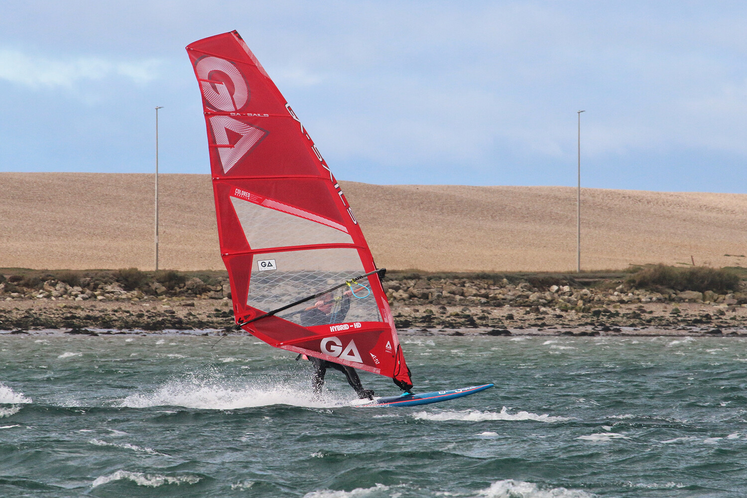 GA Sails class their Hybrid as the “ultimate all-rounder”, stretching over eleven sizes and morphing from a user-friendly wave sail in the smaller sizes (3.7 to 4.7m) to an easy freemove motor in the mid sizes (5.2 to 6.4m) and onto a freeride engine in the largest sizes (6.7 to 8.2m). Sporting the same dimensions and panel layout as the 6.0m Hybrid tested last year, its design remains unchanged for 2021 … yet the visual appearance has been sharpened with a colour-coded tack fairing and the graphical printing standing out more. Rigged on a C100 RDM mast, the Hybrid is also compatible with SDMs … an attribute that’s becoming increasingly rare in this size sail. It sets with a progressive amount of looseness extending along its leech, with a moderate amount of luff curve and only a subtle degree of shaping evident in the lower panels at rest. The bottom two battens retain rotation around the mast, even on maximum tension, and there are two closely located eyelets to choose from in the clew.
