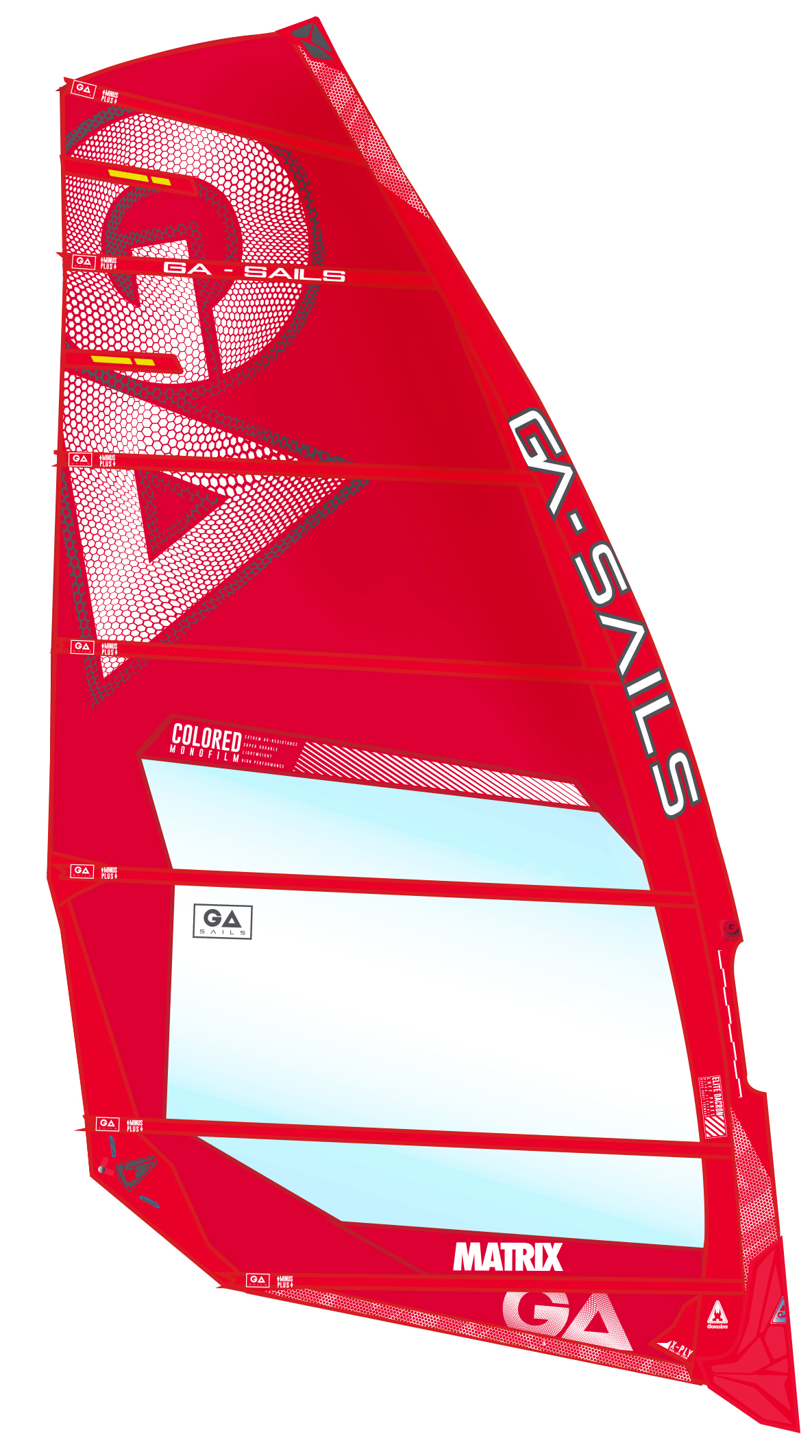 The Matrix is the high performance no-cam freeride sail from GA Sails, sitting between the crossover Hybrid (tested last month) and twin-cam Cosmic in their lineup. Completely revised for the 2020 season, there have reportedly been some additional updates for this year, including a slight increase in luff curve for improved tension and stability, a concentration of the sail’s profile further forward to reduce backhand pressure, and a change in the foot outline to make it more race oriented. Available in two distinct colourways, using 5-mil coloured monofilm in its upper panels, it was tested here on a 100 SDM and sets with a moderate to high amount of luff curve, the three lowest battens retaining plenty of rotation around the mast at rest. There are two luff panels – an outer x-ply panel extending the length of the sail and an inner tapered one, made of what GA are calling Elite Dacron, said to be “ultra flexible, keeping the draft forward”. ­There are no visual tuning gauges provided, yet there’s plenty of tuning range to play with, the leech falling away progressively to batten five yet remaining relatively tight in the panel above the clew.