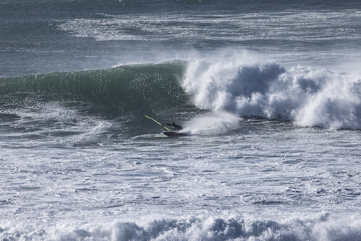 The wave is difficult to read and a misplaced turn sends me towards the rocks along with a broken mast. I make it back to shore with a messed up rig, but high on adrenaline. I make a second attempt at sailing. Soon after, I’m not paying enough attention and a monster set rolls over me from behind, forcing me to swim again. I take it easy and go with the flow; Thomas also ends the session on the rocks. Even for his light weight, the wind on the inside was too weak. On the rocks we meet Mat Pelikan, himself a windsurfer from Portugal and our photographer on this trip, as well as Jamie Hancock and Luke Raistrick, the two Brits filming for the next Windsurf Project movie.