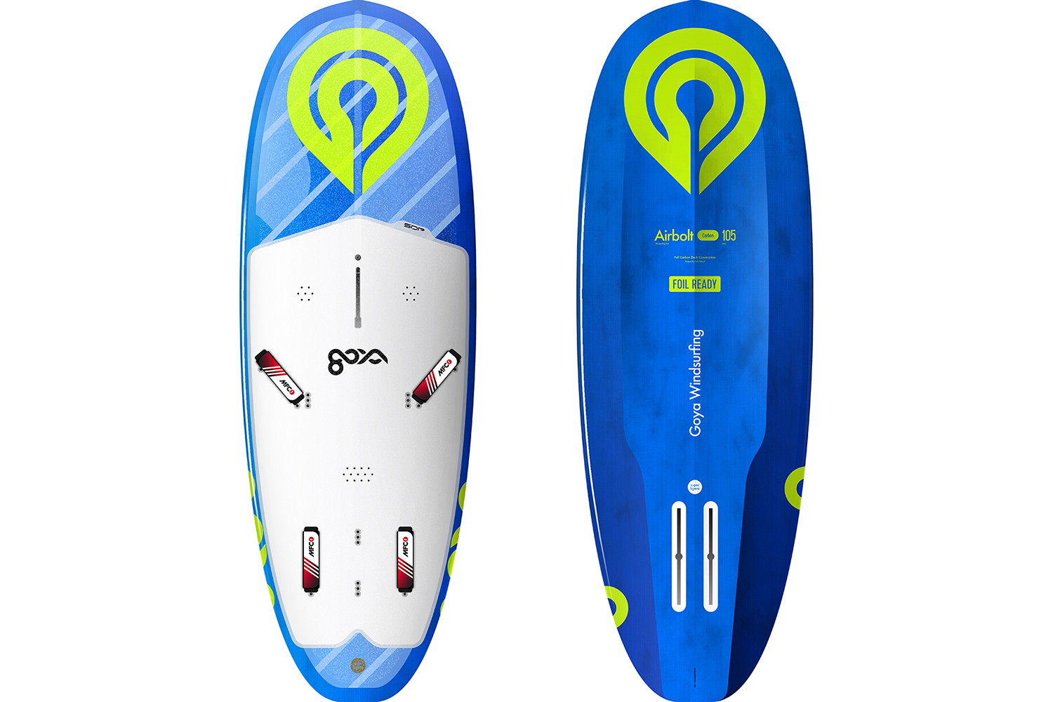 The Airbolt range has been extended significantly for the 2022/2023 season, with the introduction of three new sizes, this 90 seated firmly as the smallest in the series. Comparatively long and narrow for its quoted volume, it has a flowing harmonious outline, with a rounded nose, parallel rails and squashed tail. The subtly domed deck features plenty of footstrap plug options for both wind foiling and wing foiling, and an extended diamond-grooved deckpad covering much of its surface. To counter the deck’s cleanness and simplicity, the underside of the 90 is wonderfully complex and interesting. There are deep chines forged along the board’s rail length, from nose to tail, creating a raised central section along the 90’s spine. The chine is hollowed out, creating a concave along its length and there’s a step in the chine just before the foil boxes, making the central spine even narrower in the tail. Pronounced double concave in the nose steadily diminishes towards the rear and foil tracks to complete the picture – a involved and unique bottom shape, more akin to that seen in wing-specific boards in recent years. Supplied with MFC’s latest Velcro straps and with a leash plug in the rear, the 90 also has a handle in the hull, just in front of the foil boxes to maximise its launching and landing practicality.