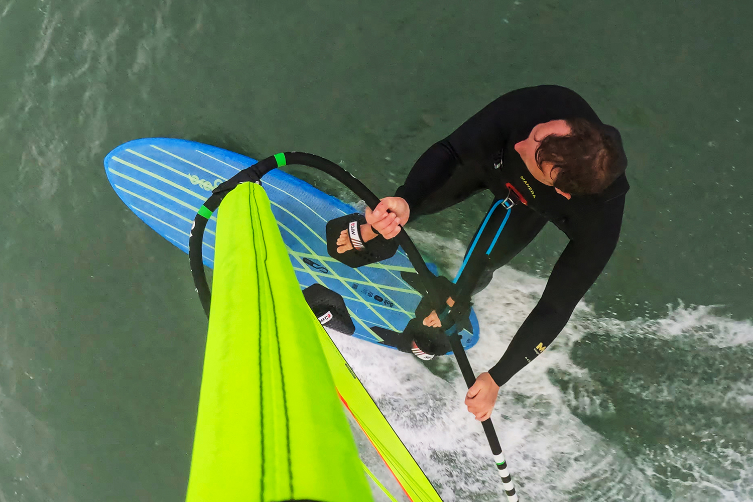 Straight out of the box, the Bolt grabs your attention – Its appearance, rocker line, concave deck, and volume distribution make for a beautiful board, which is noticeably light in the hands. Its appearance is almost reptilian, layered up from a lightly brushed carbon blue, with fine diagonal detailing, before finishing off with lime green lines, which run the length of the board. The Bolt’s volume has been distributed a little more boldly than some other on tests – with the majority of the volume sitting just in front of the footstraps before thinning out towards the tail. The rear of the Bolt blends beautifully into the front section where a new nose shape has been designed to eliminate the breaking point, resulting in a stronger nose structure, it also looks pretty good too. Staying up front an obvious concave deck is present as well as a recessed mast track, which helps provide control when pushing the limits. Branded as Goya’s Freerace board, the Bolt carries a sportier outline with its straps set on double density pads and generally more towards the rails, there is however some adjustment here to enable you to set them a touch further inboard on the flatter section of the deck. On the underside, a pronounced vee double concave runs the length of the board, shallowing out to a vee in the tail which pulls into a rounded pin tail – where cutouts also sit to help reduce the Bolt’s wetted surface. Available only in premium construction, with a full carbon deck on top of a full Hyper Skin HD High-Density foam sandwich, keeps the Bolt lightweight and stiff. The two larger sizes of the Bolt are foil-ready with a deep Tuttle box, which is a great touch for those wanting a little extra versatility. Overall, on first appearances and set up, the Bolt is incredibly attractive with its design features exuding excitement.