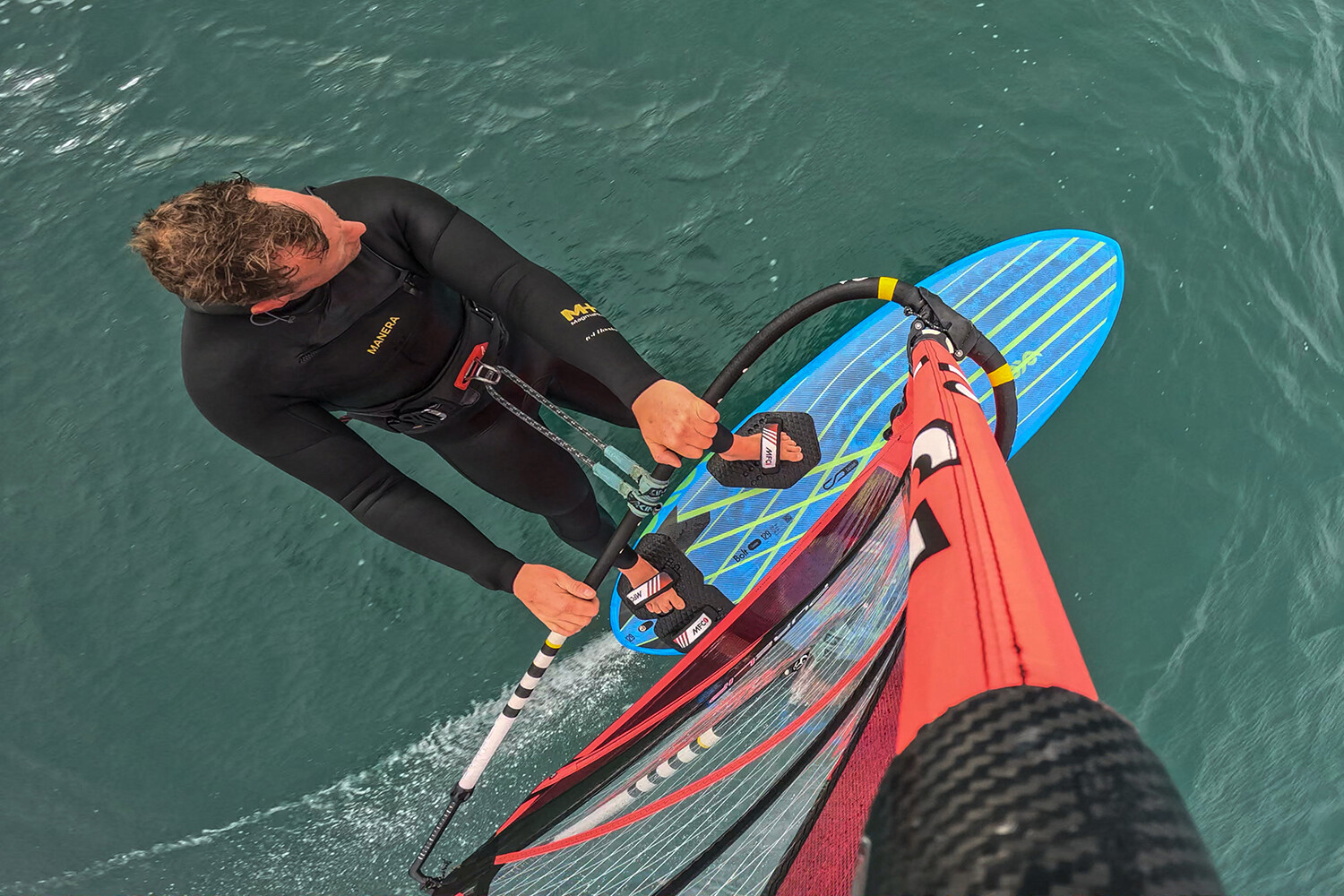 The Bolt is still a freerace board and handles as you would expect off the foil, requiring no drastic change in input to get the Bolt up and moving. The Bolt is quick to accelerate, get planing and up to full speed, with the straps placed a little more inboard than usual to suit the foil, and a more upright stance is required. The straps are easy to locate. Lifting out of the water is very much driven by the rider. Meanwhile, the foil box isn’t set behind the back strap, but is slightly offset, giving the rider complete and utter control in the initial angle of attack and ride height. Up and foiling, the Bolt is a very pleasant surprise, immediately feeling natural in the air, excelling when foiling with smaller, well-powered rigs. Its freeride taper in the tail makes everything feel familiar, whilst helping you to resist the urge to over sheet. It’s not going to allow you to drive hard upwind, but the Bolt isn’t about that, the Bolt delivers versatility, fun and freedom. Paired with a foil, where there is a nice gap between the front wing and foil mast, the Bolt has a really nice neutral ride, never asking for any extra effort from either the front or back foot, which allows you to channel your energy and focus elsewhere. Through touch downs, the tail sheds water like it’s water off a duck’s back, allowing you to carry and hold speed as you ride back up. The rocker in the nose and pronounced vee double concave hull assist when touching down with the nose. Through the gybes, it feels natural as its familiar shape doesn’t require any huge changes in technique. On the exit, making sure to land that new back foot right in front of the back straps to maintain lift to compensate for the offset foil box – that is the only small, but noticeable adjustment required. Unlike the majority of foil boards out there, there is ample space to tack to help you work your way back upwind. The Bolt never asks anything more of you in order for it to perform, it delivers foiling fun whilst still being able to deliver on the fin.