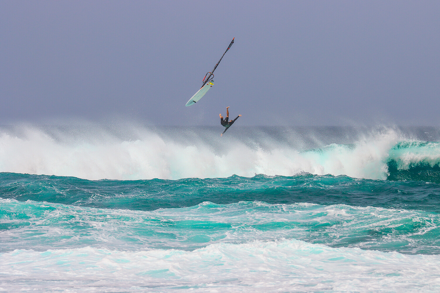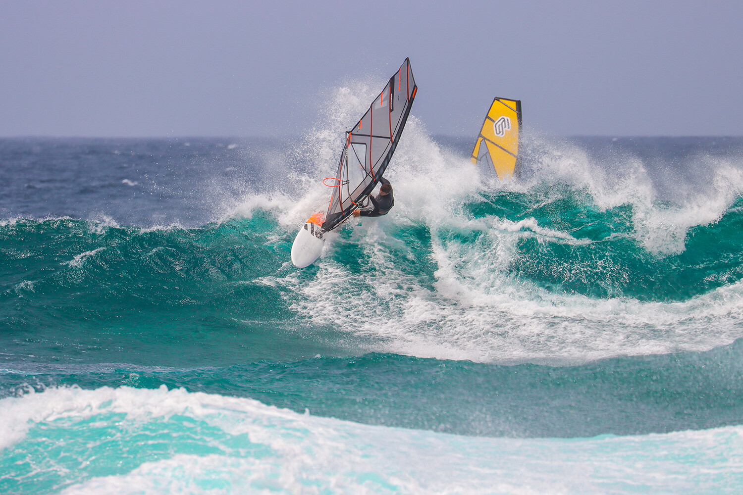 A massive thanks has to go to Ulises Aguiar Vera, who lives in the north of the island and always lets us know when it’s looking good. Josep Pons is always the one that wants to sail there. He will go out whatever the conditions, including when it’s massive and zero wind. I have to say I am a bit more selective in my older age, but it’s so nice to have someone fully motivated. Plus he is so competitive, which is great to push a bit. Often days like these are sketchy and the consequences can be quite severe, but when I see Pons smash out an aerial on a solid set, I just have to push as well! The wave we sailed is a heavy slab and timing it right is critical. Too early and there is nothing to turn off, but a millisecond too late and it’s total punishment. I definitely had a few heart in the mouth moments, but that is what makes it fun.