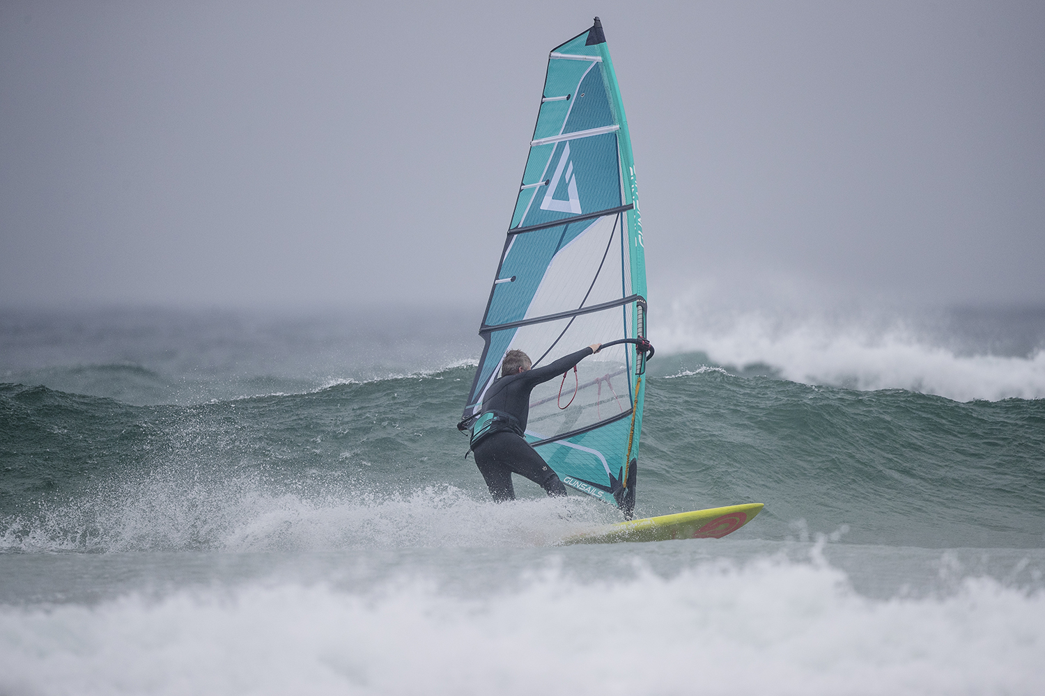 Stepping into its fourth season, the Horizon is Gunsails‘ five-batten ‘Power Wave’ option and is described as “truly all-round” for use in all conditions, from cross-off utopia to bump-and-jump skate parks. Such is its intended versatility in application, that Gunsails have evolved the sail’s shaping through the sizes. The smaller sizes (up to this 5.0m) are oriented towards strong winds and more extreme action, whereas the three larger sizes have fuller profiles for more drive and coastal blasting prowess. And to provide extra practicality, the 5.7m and 6.1m are also compatible with SDMs should the need arise. For 2022, the Horizon 5.0m’s luff length has been reduced and boom length extended, with the intention of lowering the draft and enhancing the smoothness of its power delivery. Rigged here on a Select 400 RDM, it sets with a moderate amount of luff curve, the recommended extension only just enabling the leech’s looseness to touch the brand’s famous F.R.E.D. marker in the head, so we extended the extension an extra notch to provide more tuning margin. Setting relatively flat at rest, the bottom two battens protrude beyond the mast’s leading edge, before using one of the two clew eyelets offered to pull the sail out and set the draft. Detailing is both functional and current, with all the features you’d expect of a modern sail, from beading along the foot of the sail and both sides of the bottom batten, to alternating batten pockets and double stitch seams around the x-ply window.