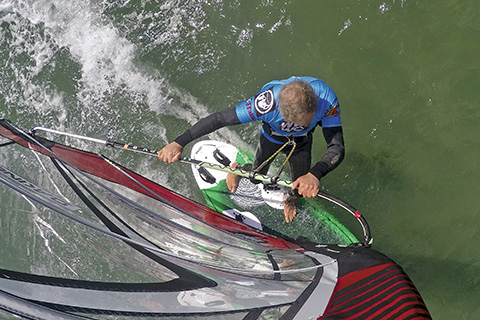 On extended arms holding a powered sail, you’ll also discover that it’s easier to sheet in and out by turning the hips rather than pushing and pulling with the arms.