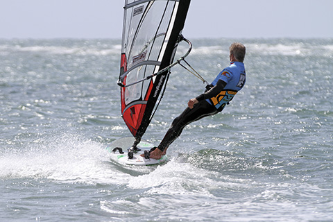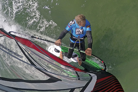 // Balanced joy! For its size this 120 has a relatively small (40 cm) fin, so it’s more comfortable to line the power up with the front foot. Sailing on the front foot, you’re always in better shape to gybe.