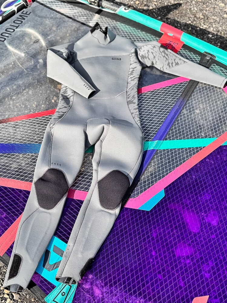 The small ‘battens’ on the ankles (AKA Water Defender Legs) seem to work well, I was quite surprised by the effectiveness of this innovation. I tried sailing without the (included) ankle straps and suffered no ’elephant leg’. Not having straps to put on and take off at the end of a long session is very welcome. Plus, if you have ever got your wetsuit nearly off your legs only to remember the ankle straps are still on, you see the advantage of going strap-free! A couple of spare leg battens are included too.