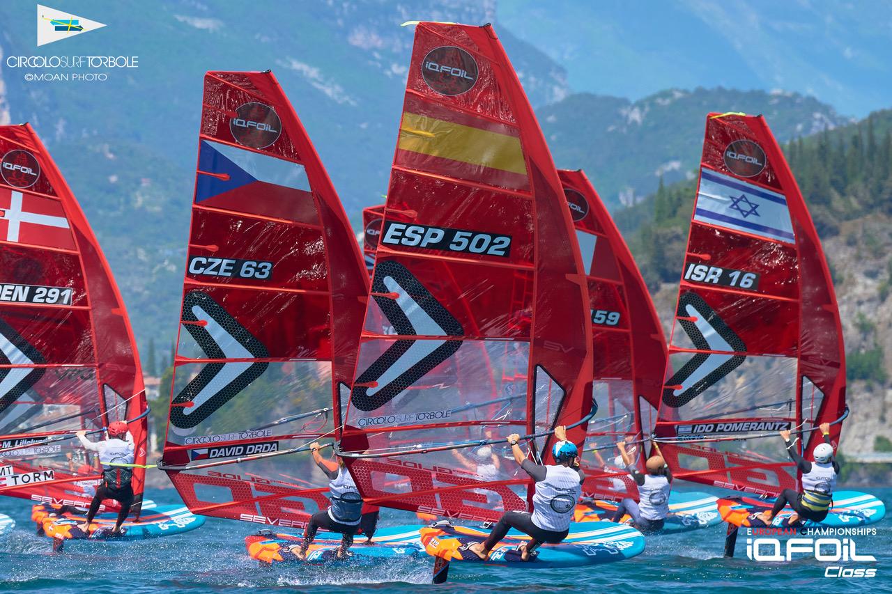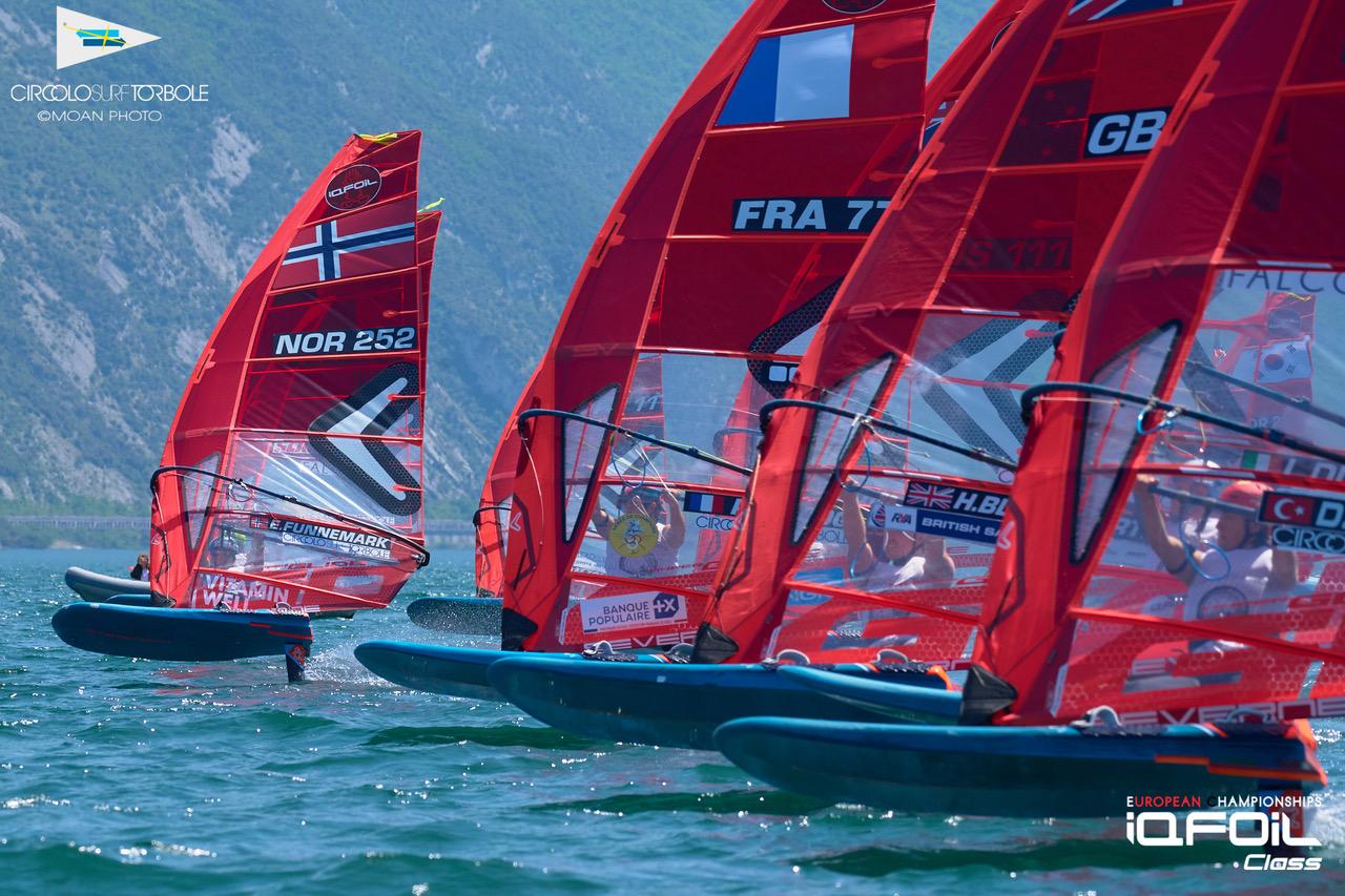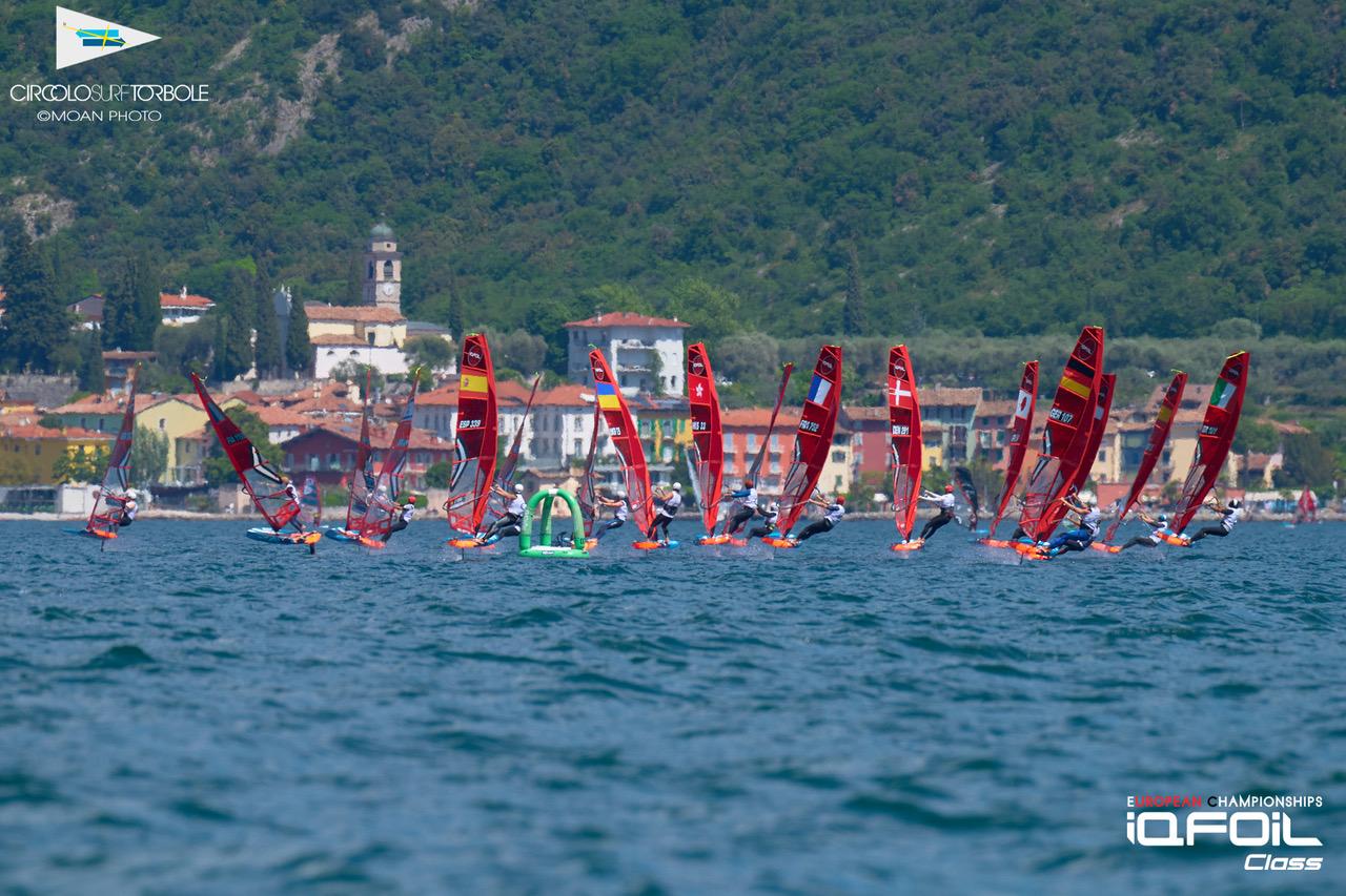 The iQFoil class European Championships in Torbole, Italy have kicked off in Italy with four slaloms for men and women on the opening day of action.