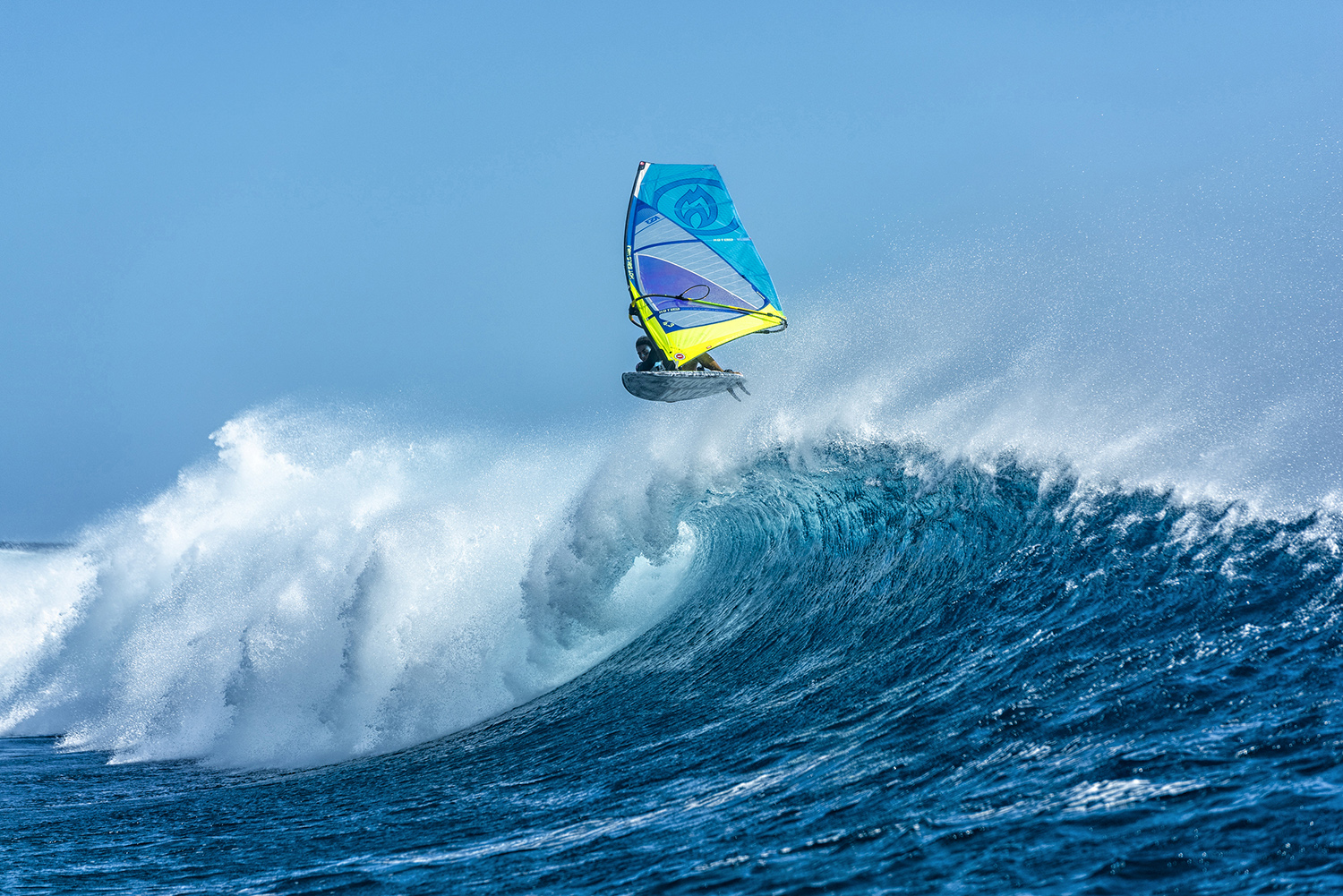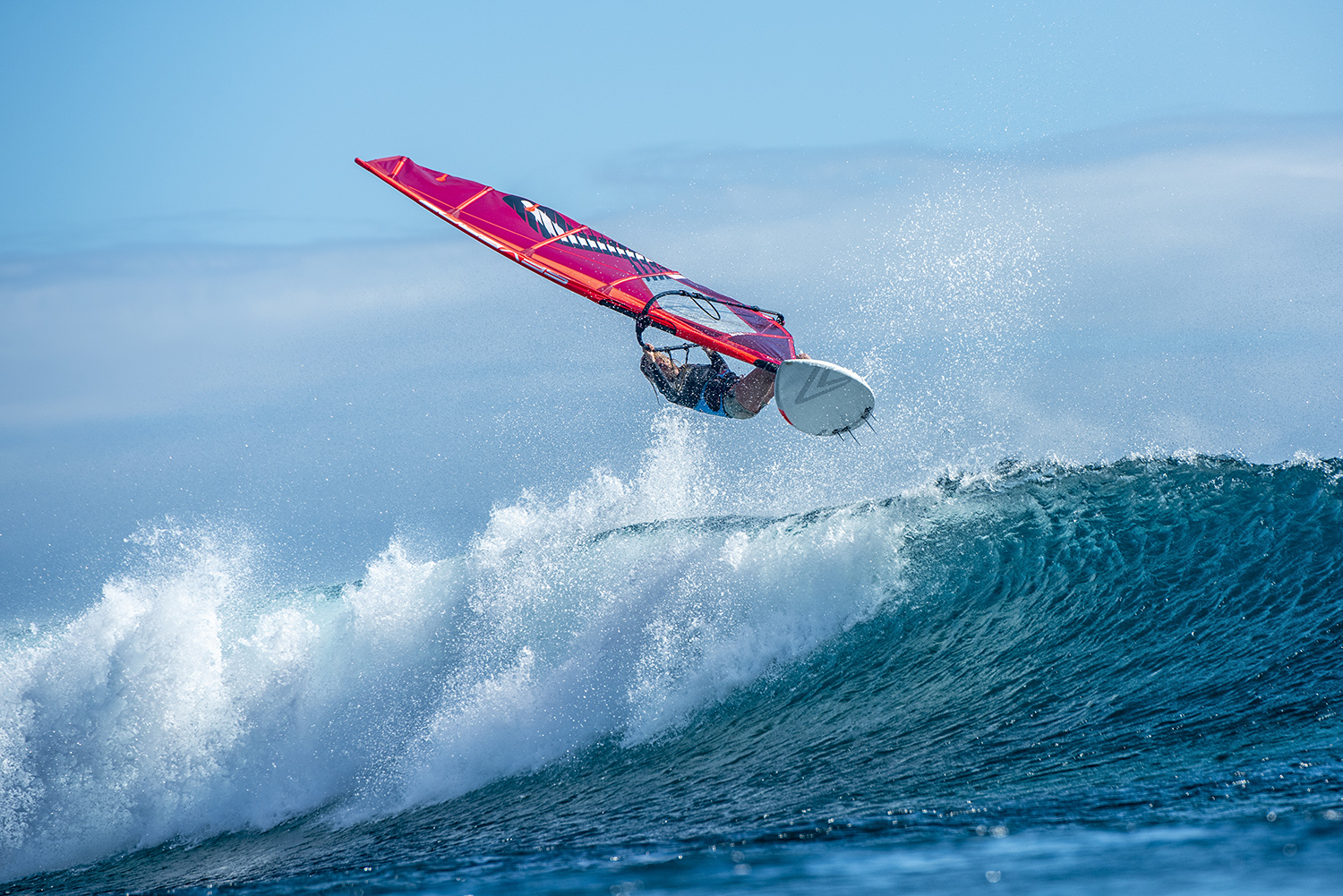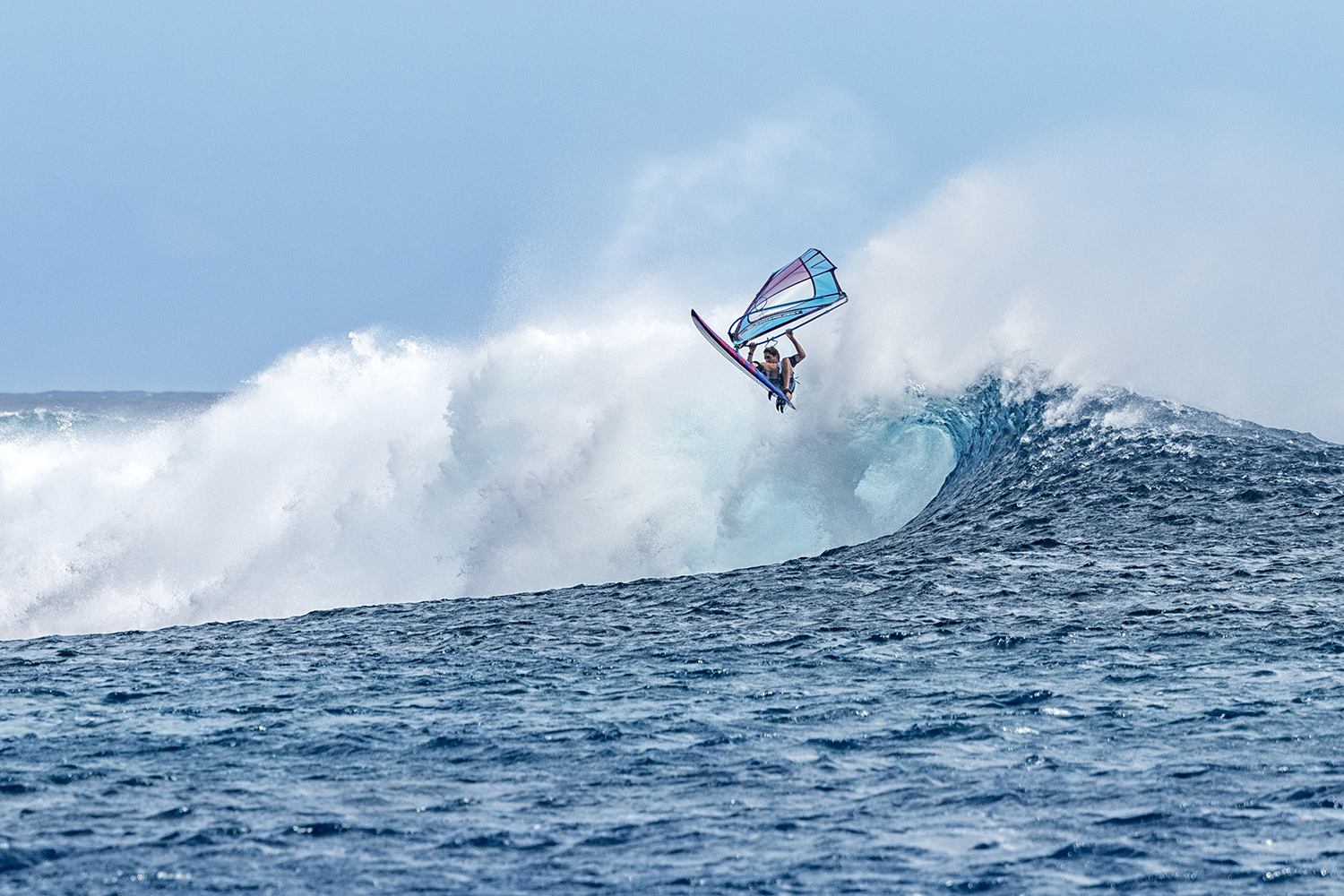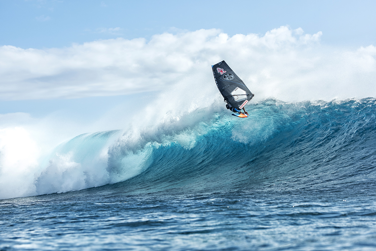 After a lifetime of windsurfing some of the best waves in the world, I guess it is normal to feel spoilt and let down sometimes when you arrive at “epic” spots and you discover that there are good things and bad things about the wave, but this simply wasn’t the case at Cloudbreak. The first wave I caught felt exactly the same as when I had surfed the wave, only it was easier to catch as I had a sail, and also easier to make the sections as the wind was so perfectly angled that you could fly down the line to get past them. It was about logo high the first day, with some mast high sets. The tide was high which meant it was actually as safe as possible because you could do an aerial on the final ‘shish kebabs’ section and then straighten out and sail over the reef. I couldn’t believe how perfect every wave was. I would compare it to a really excellent Kona winds day at Lanes on Maui, but with less space after the reef before the wave jacks up, and as such, less time for chop to build up. The waves were as smooth as butter, as steep and powerful as you would ever want them for windsurfing and the barrel sections were just long enough to frighten you when you hit an aerial, but also not so long that you couldn’t make it past them in the air. It is literally the best windsurfing wave I have ever experienced.