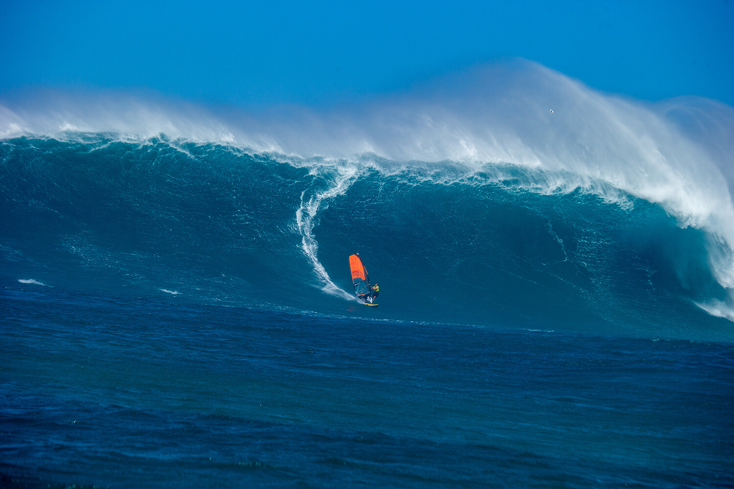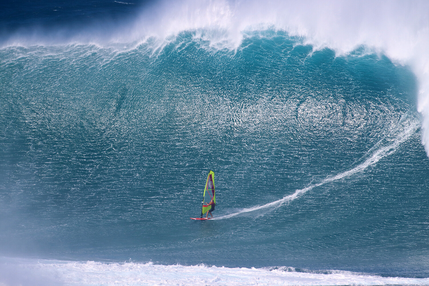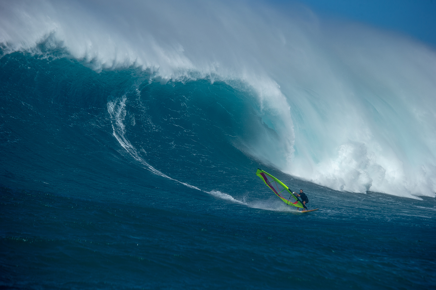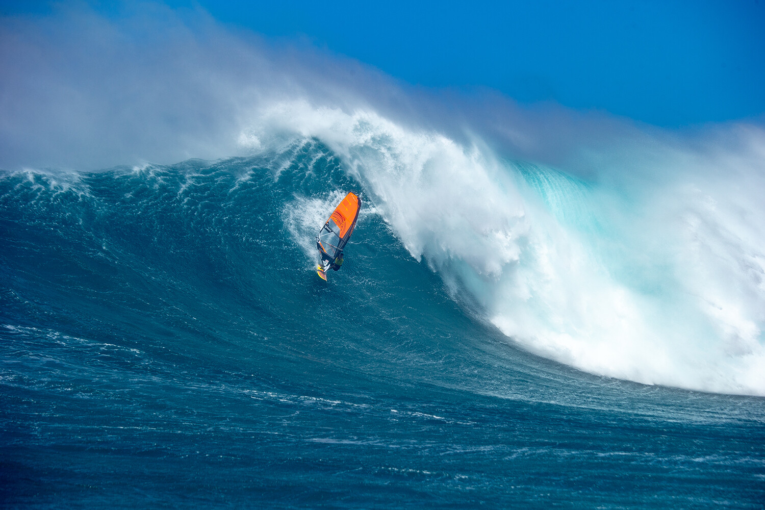We usually use 4.7 or 5.0 sails at Jaws, very rarely 5.3 and 4.5, and for the big day I used a 5.0. Now I have a really good custom Naish board that Michi Schweiger made me which is amazing, it’s basically a windsurf big wave gun board. It’s longer – 8’0” and a bit narrower then a normal 88 litre wave board and it has a swallow tail. It’s a quad and it’s a really fast and stable board, which is what you need for monster waves. You go much faster at Jaws then you would go at Ho’okipa and sometimes on many waves there is just one big piece of chop that if you don’t have enough board length and grip to deal with it you can spin out and your session is done!