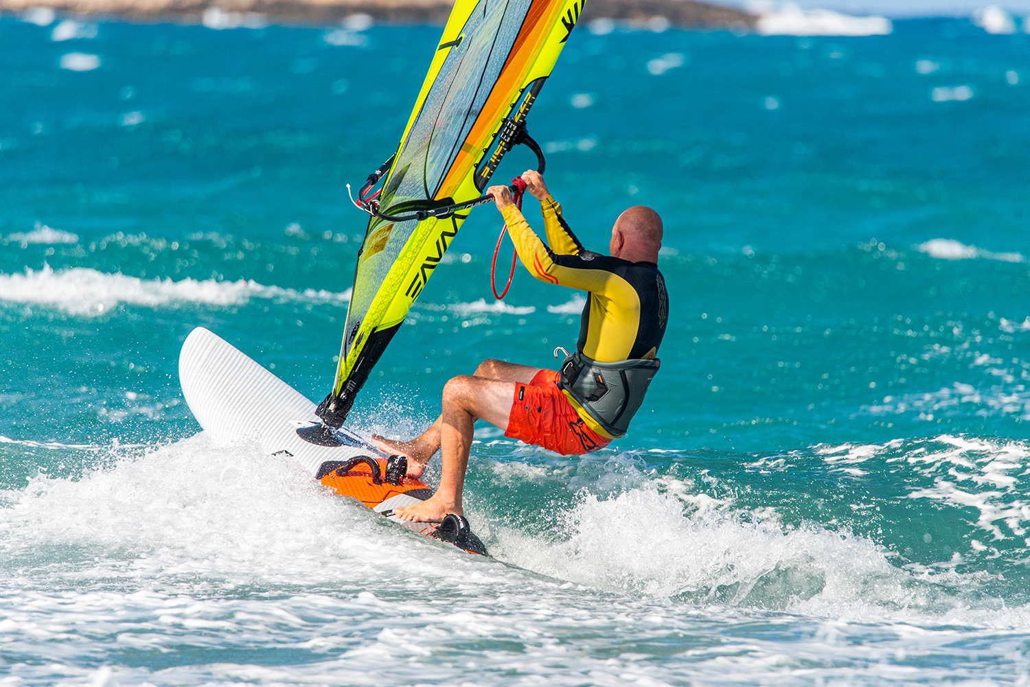 • Extend and bend – pull down hard on front arm and bend your back leg, this is a game changer. Get your head at boom height at least. This will power up the sail and flatten the board so it is not creating drag.