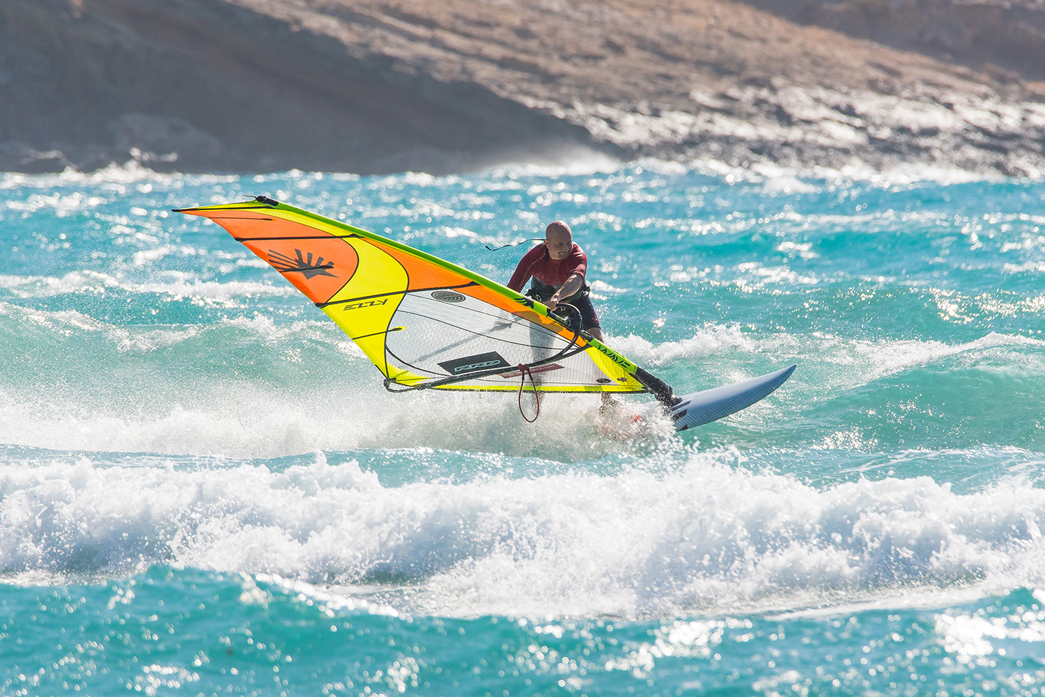 - As you drop down the wave, keep the sail sheeted out and your back leg bent, pulling the tail underneath you. You then have the option to drop down the wave, away from it, and do another backside turn, or carry on along the wave ‘beach bound’, or set up for a frontside turn.