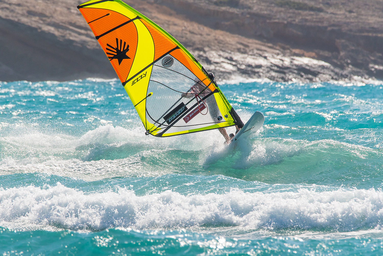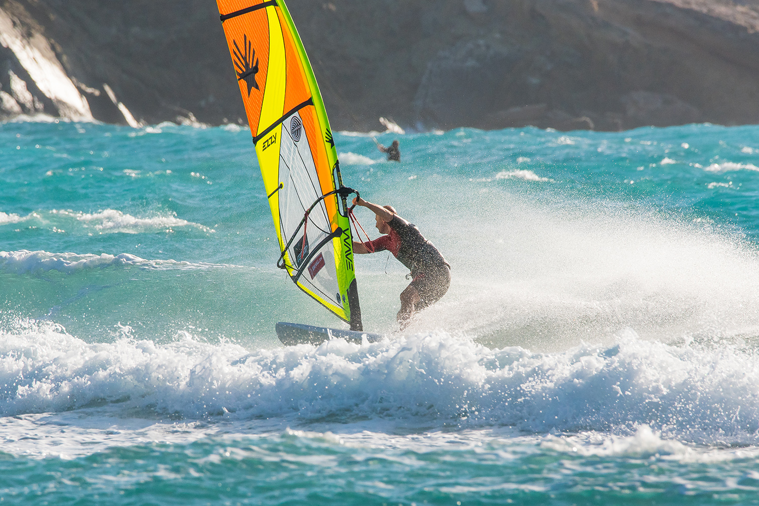 - Wiggle on swell: in open sea conditions build on your flat water carving by doing the same on swell and look to stay on the swell and use its energy. One tip is to carve back down (wind) the swell way before you reach the top.