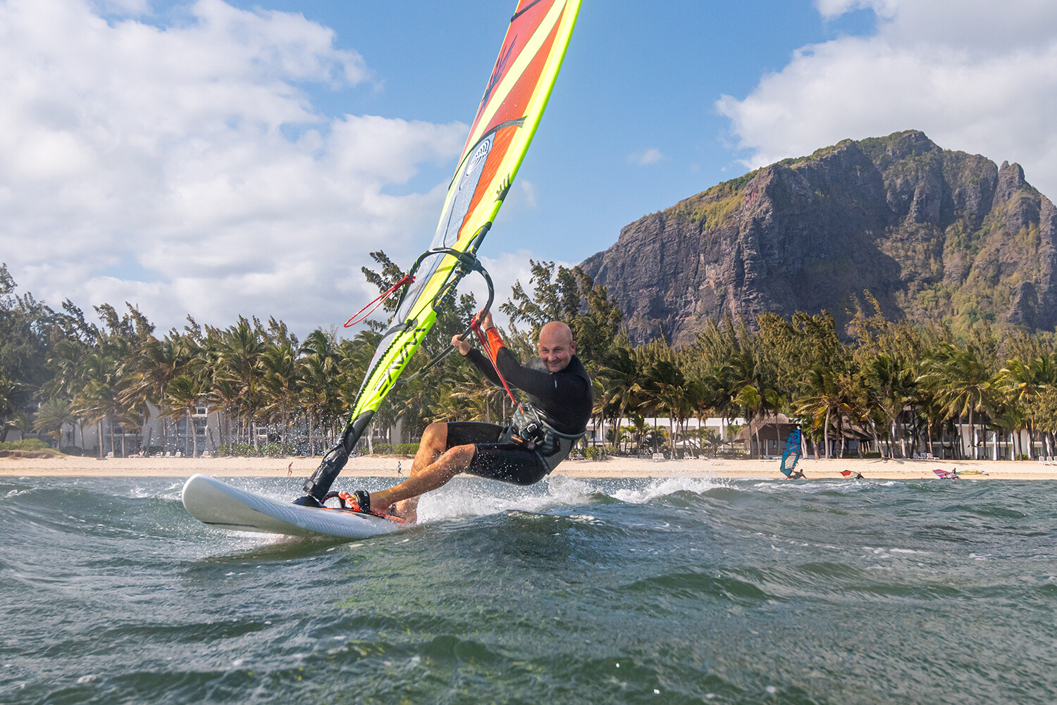 - Keep that mast arm out to sheet out when exiting your gybes clew first, so that the sail has time to breathe and this will give you more balance.