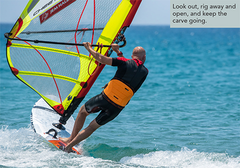 • Stalling the sail mid carve. This is due to over sheeting in the middle of the carve whilst still downwind. It is exacerbated by not getting your hands far enough down the boom on the new side.