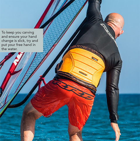 • Get old front hand to back of boom: This is crucial and very much a deal sealer. With your hand right at the back you have more leverage to pull the sail across and this will help with a smoother carve.