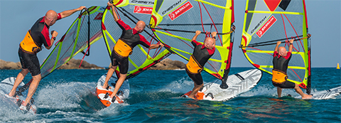 • Sail ducking: Now you can get the sail rotation part of the move nailed. Sail along, slightly off the wind, with a wide stable stance. Slide your back hand down the boom. Tip the rig towards the nose of the board. Let go with your front hand. Lean back as the rig gets heavy here. Cross front hand over to reach to the VERY back of boom. Whip the sail across past your ear and be aggressive. Catch sail on the new side with front hand past the front harness line. Hold it clew first and then rotate the rig. Look forwards throughout. Do it many times and both ways!