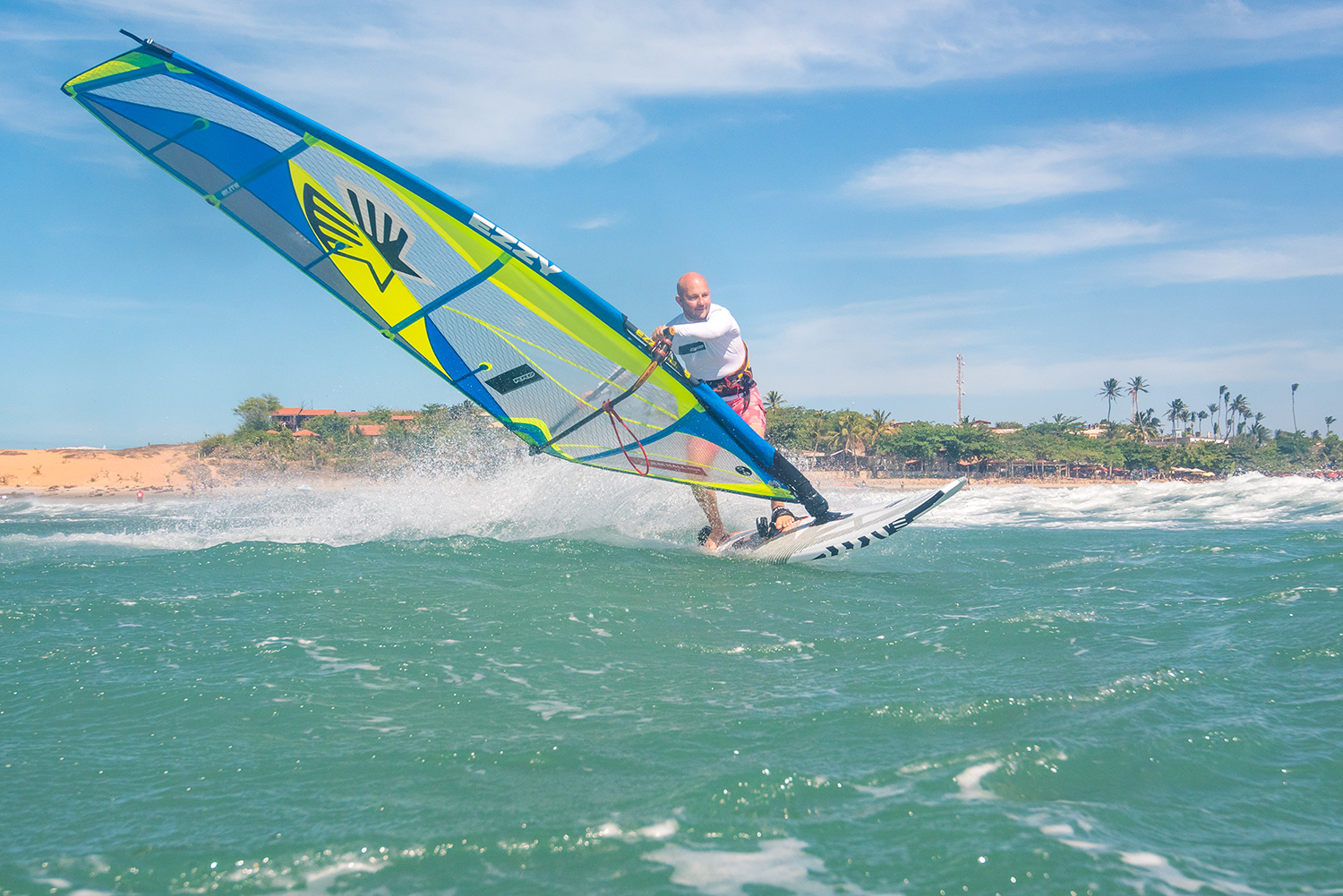 It’s the best place I’ve found to learn, improve and coach wave sailing. The wind angle is such that you can’t help but sail down-the-line. People who have never sailed in waves before find themselves on an unbroken face riding downwind on their first session. Improving wave sailors have spent much of their lives fleeing oversized swells – but in Jeri the softness of the waves encourages them to charge at pitching sections, get vertical and go for aerials, all in the knowledge that a mishap will result in a warm caressing. It’s never pant-wetting big. We got a proper logo high day back in 2015 – but even then the drillings were ever so friendly.