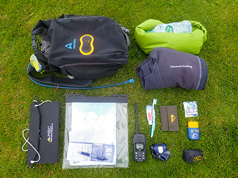 // Stuff I carried in my Aquapac rucksack: ACR ResQlink + personal locator beacon (on shoulder strap). Drybag (double protection to keep drier). Extra layer, random food (often cheese and oatcakes, pictured…flapjack), solar panel from mobilesolarchargers – works well, cables, mains adaptor etc, map case and road atlas, pen, tidal atlas printouts, tide times card, Standard Horizon handheld VHF, toothbrush and toothpaste – keep here for ease of access, wallet, waterproof head torch, mosquito / midge net (bought in Scotland, essential kit up there), sun block – refilled a few times now, spare batteries for GPS (in case of on water failure – never happened). Fleecy hat (not shown because I lost it just before this picture).