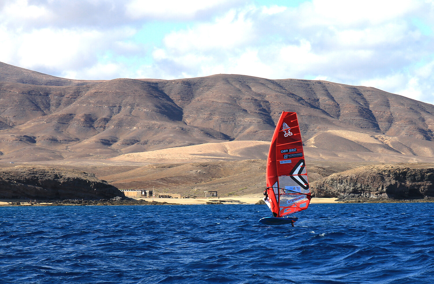 Six sailors were those who continued to the island of La Graciosa in the third leg to the beach of La Caletilla, with Mateus Isaac in the lead, followed by Sebastian Kördel and José Luis Boronat. After a half hour break for lunch and to adjust the material, all the sailors hoped that in the downwind leg the wind would be in their favour to pick up speed and enjoy the race to the maximum. And so it was. The race resumed around 15.00 to set course to the beach of Las Cucharas, in Costa Teguise. Arriving first was Mateus Isaac followed by Ramón Pastor and Sebastian Kördel. After some sections marked by the lack of wind, the rest of the race developed favorably and the sailors enjoyed the downwind with wind speeds of more than 20 knots reaching a speed of 45 km / h approximately.