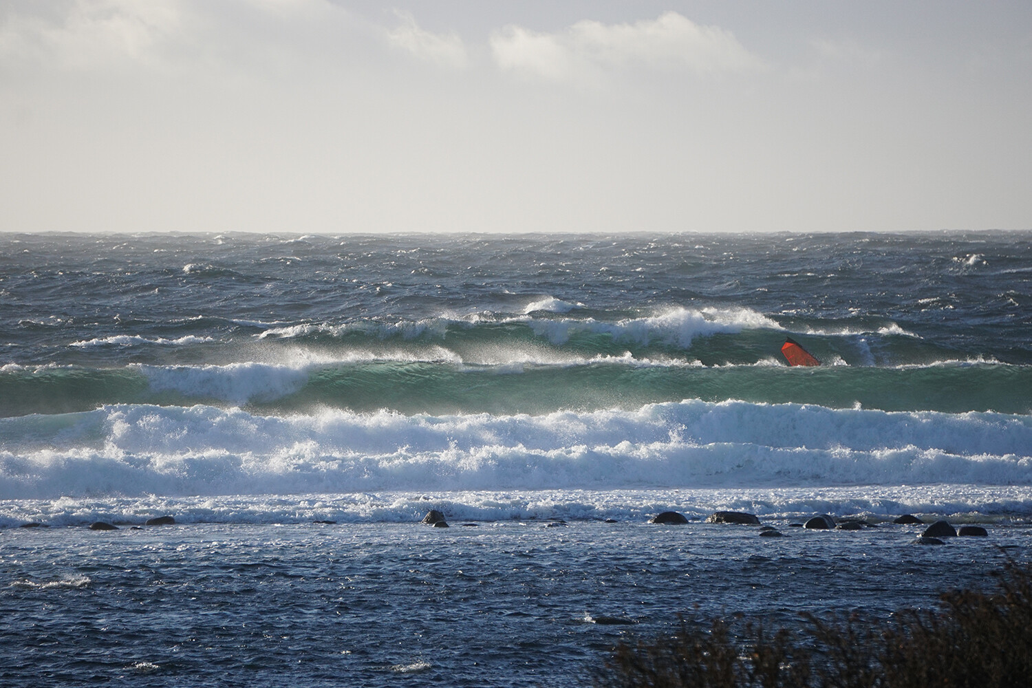 I continue out to sea, attempting to gain as much height as possible. To my right, a fellow windsurfer is upwind of me. I see him tack and head back towards the headland and the wave but I continue. I want to be in a strategic, upwind position, even if it means losing a bit of time. After another two hundred metres, I do a quick tack, turn my board around, and start heading back in.